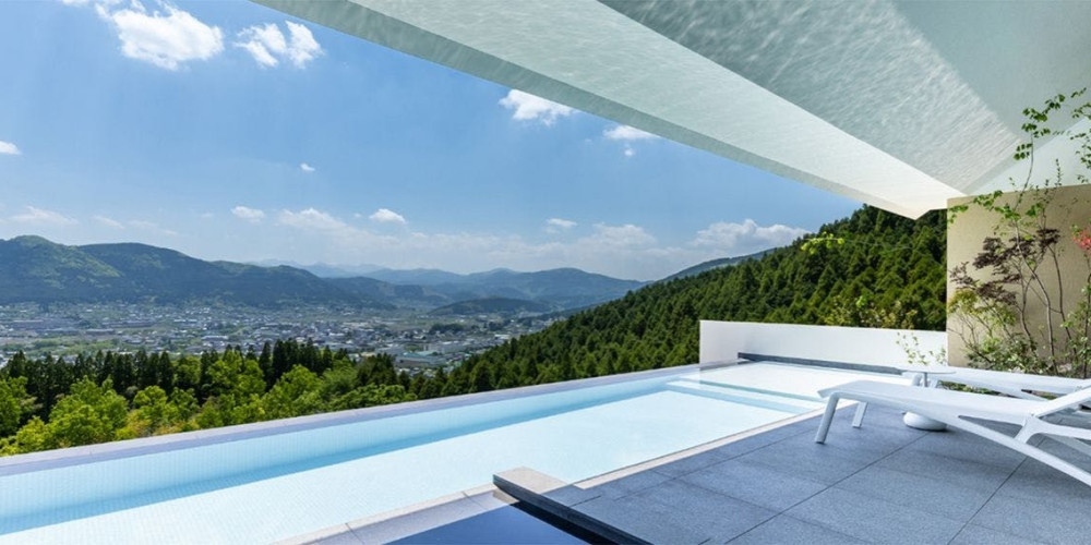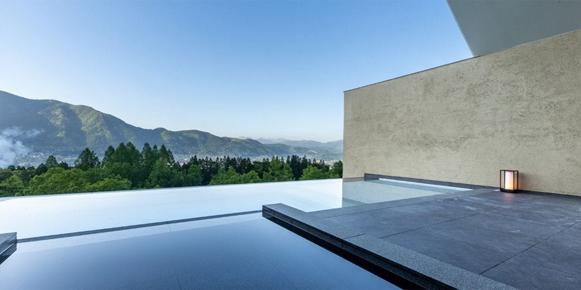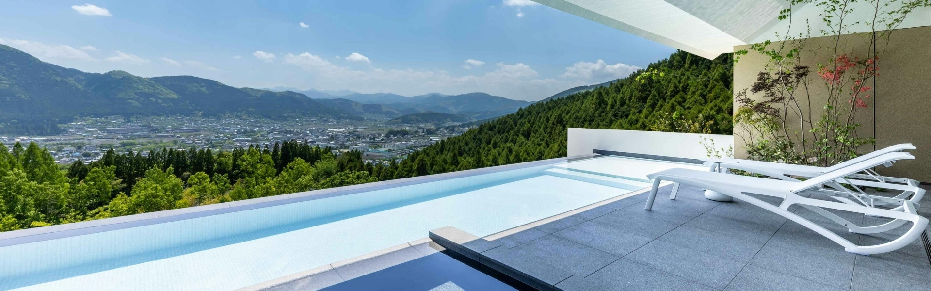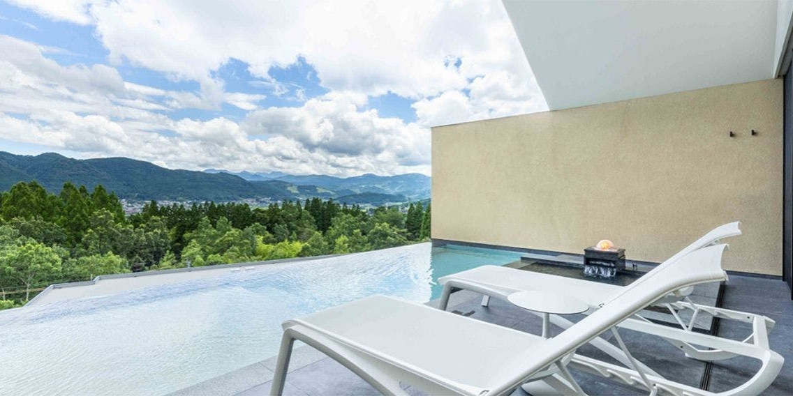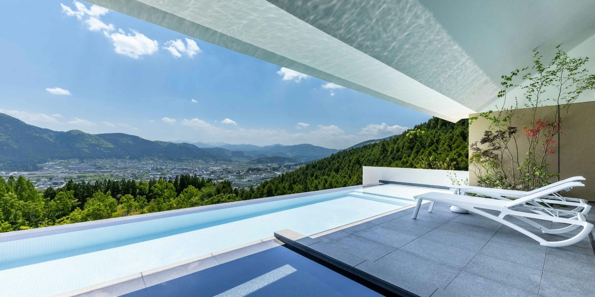 リビング、クイーンベッド×2、由布院を一望するインフィニティ―プール、露天風呂、寛ぎのテラス、バスルーム|165平米