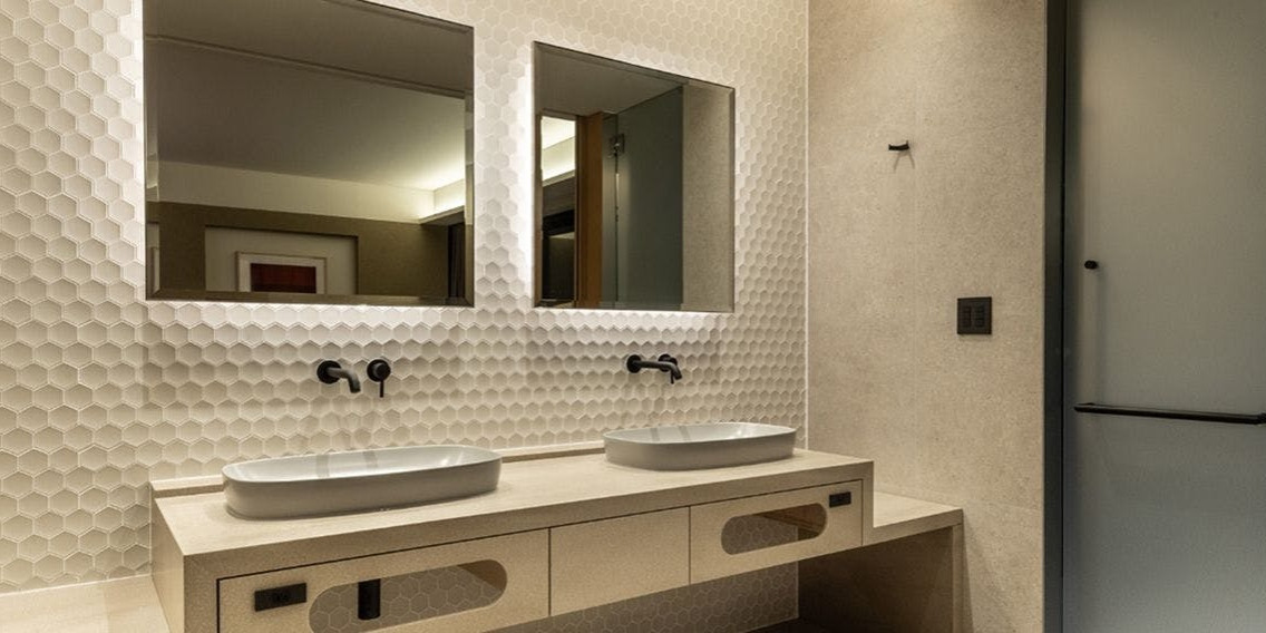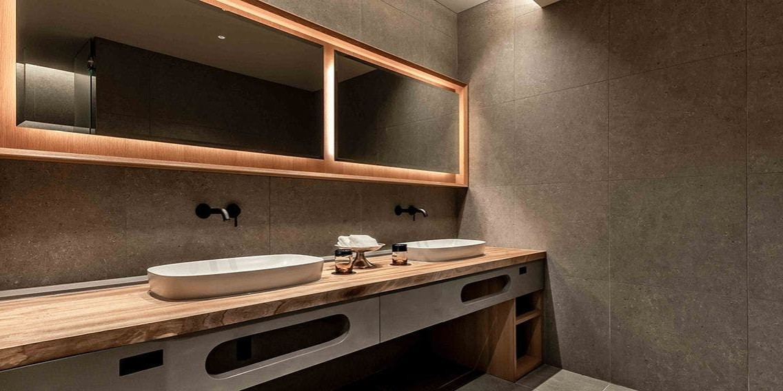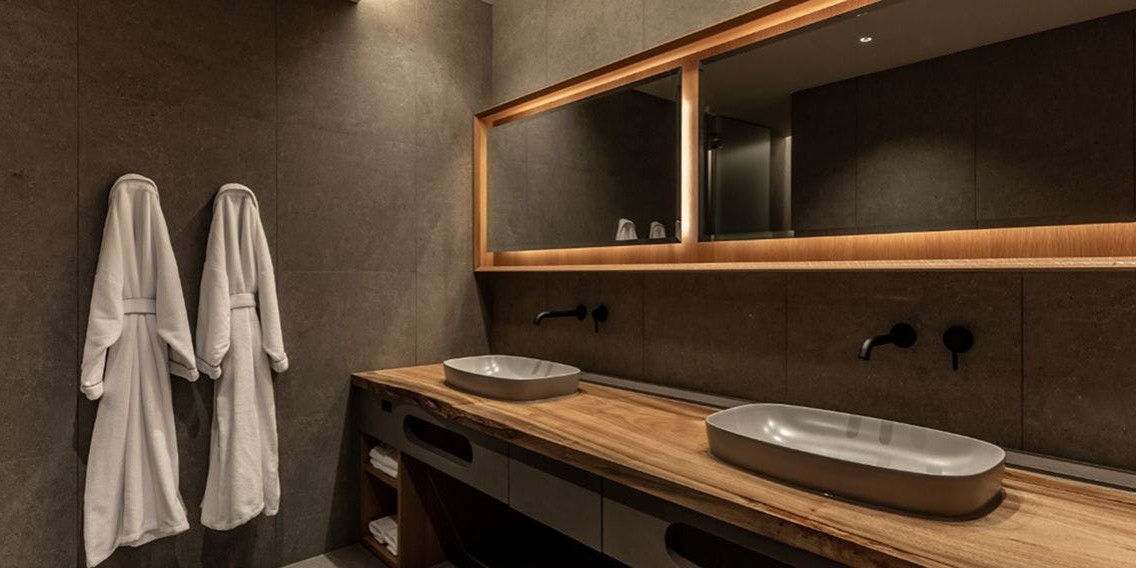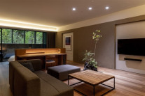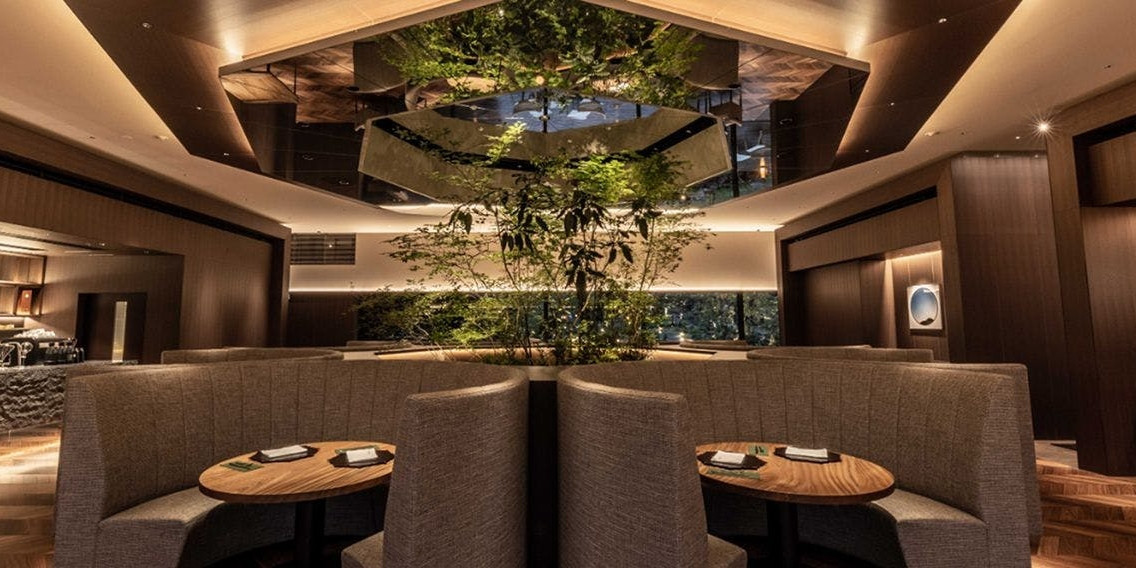 落ち着いた照明がやわらかな陰影を描き、過度な装飾を排したデザインの中に、自然を感じる植栽や素材をさりげなく配置。