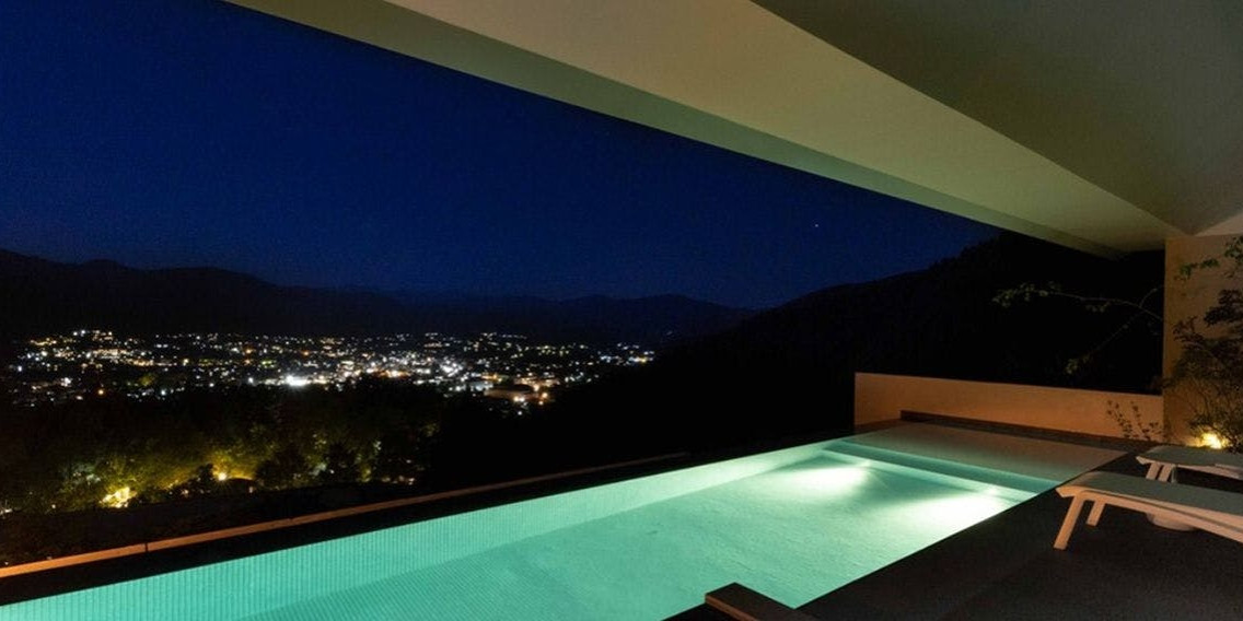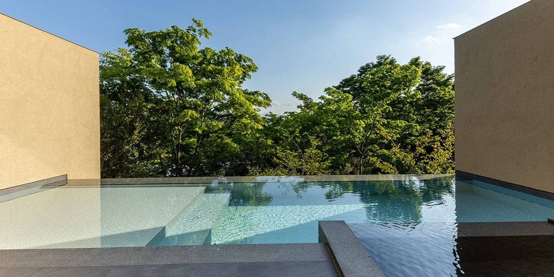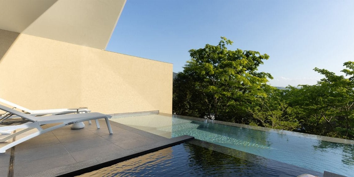 インフィニティプールから流れ落ちる水景が、建物に沿って響く滝音と重なり、穏やかなリズムを描きます。