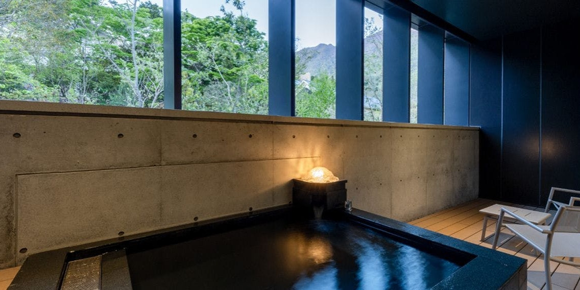 専用露天風呂に浸かれば、森そのものが寄り添うように、心を解き放つ深い静けさに包まれます。