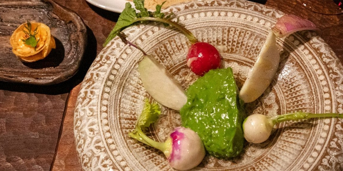 NYのミシュラン店「Blue Hill at Stone Barns」で培った経験を胸に、タシは自然と対話しながら、命の輪郭を料理で表現します。