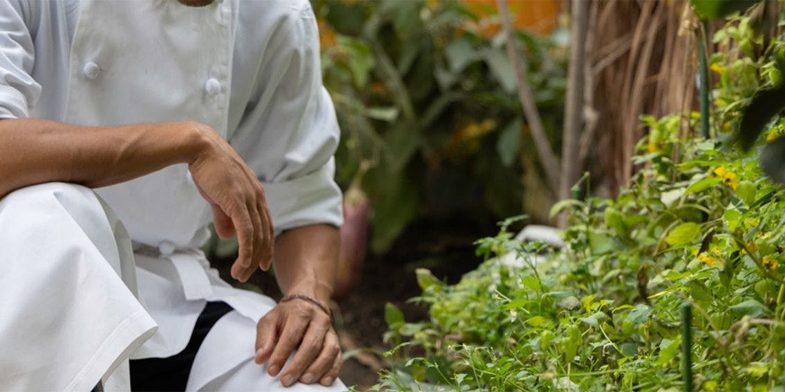 朝、シェフは畑に立ち、土の温もりと自然の鼓動を感じながら、夜の食卓に向けて静かに始まります。