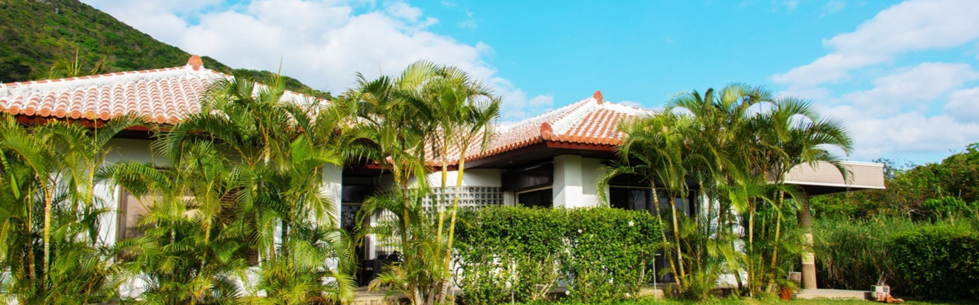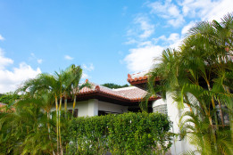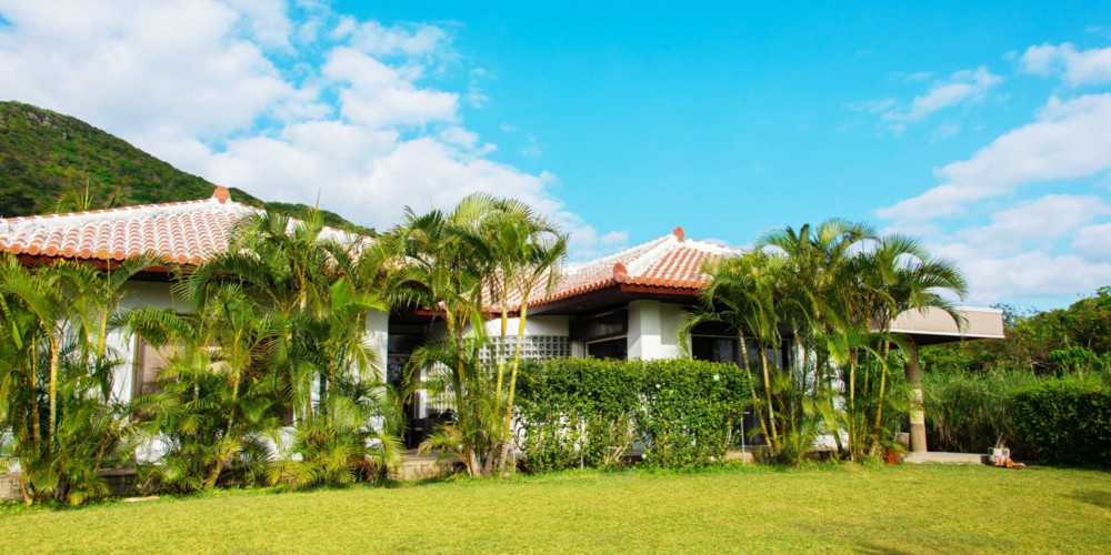 伝統的な琉球赤瓦と広い芝生が印象的な貸切リゾートヴィラ。