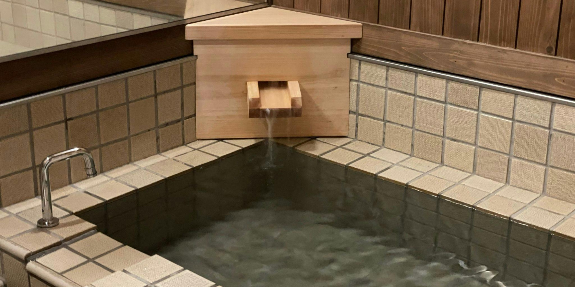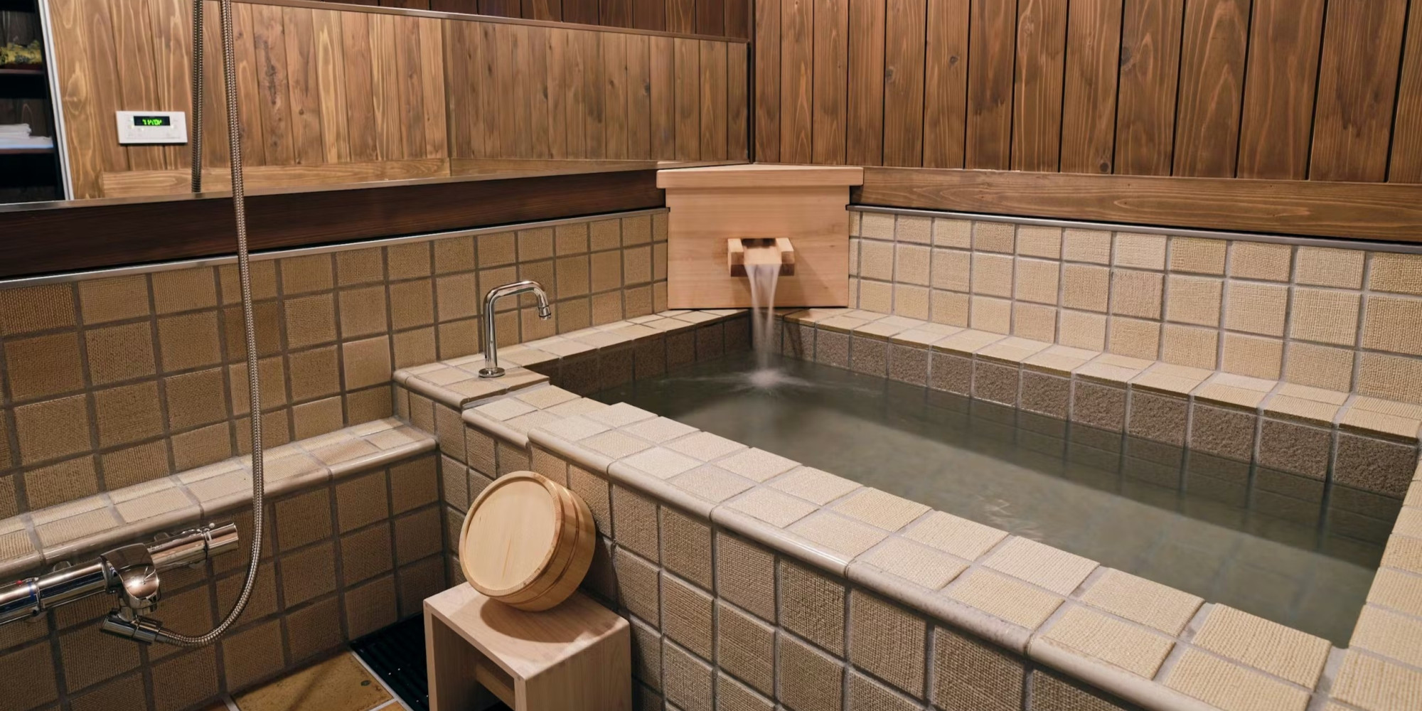 浴槽まわりと床は風合いのある美濃焼きタイル、壁や桶は天然杉材を使用し、