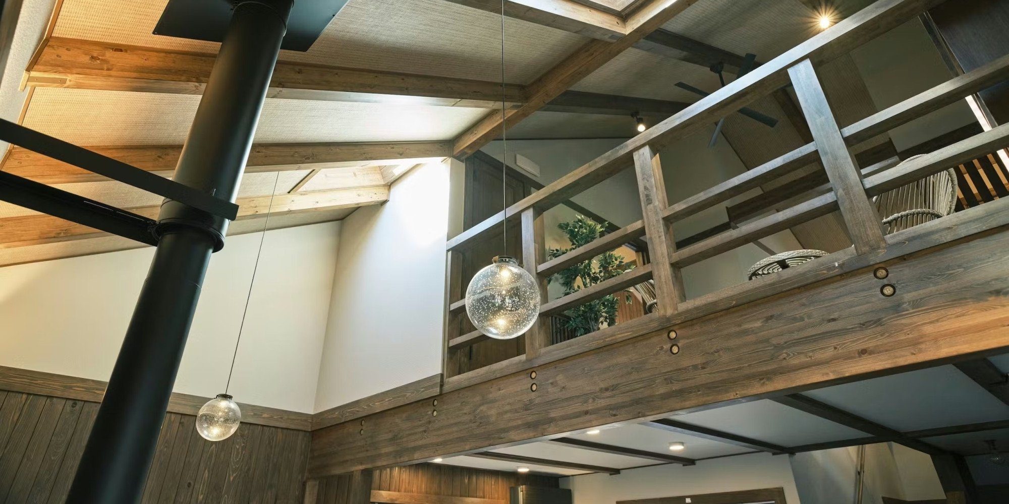 大きな吹き抜けに面し、2つの天窓から自然光が入る開放感ある落ち着いた空間のロフトです。