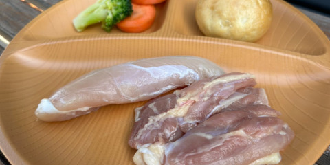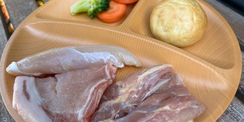 淡路島産豚ロース(50g)、鶏ささみ(80g)、鶏もも肉(80g)、ブロッコリー、人参、パン