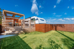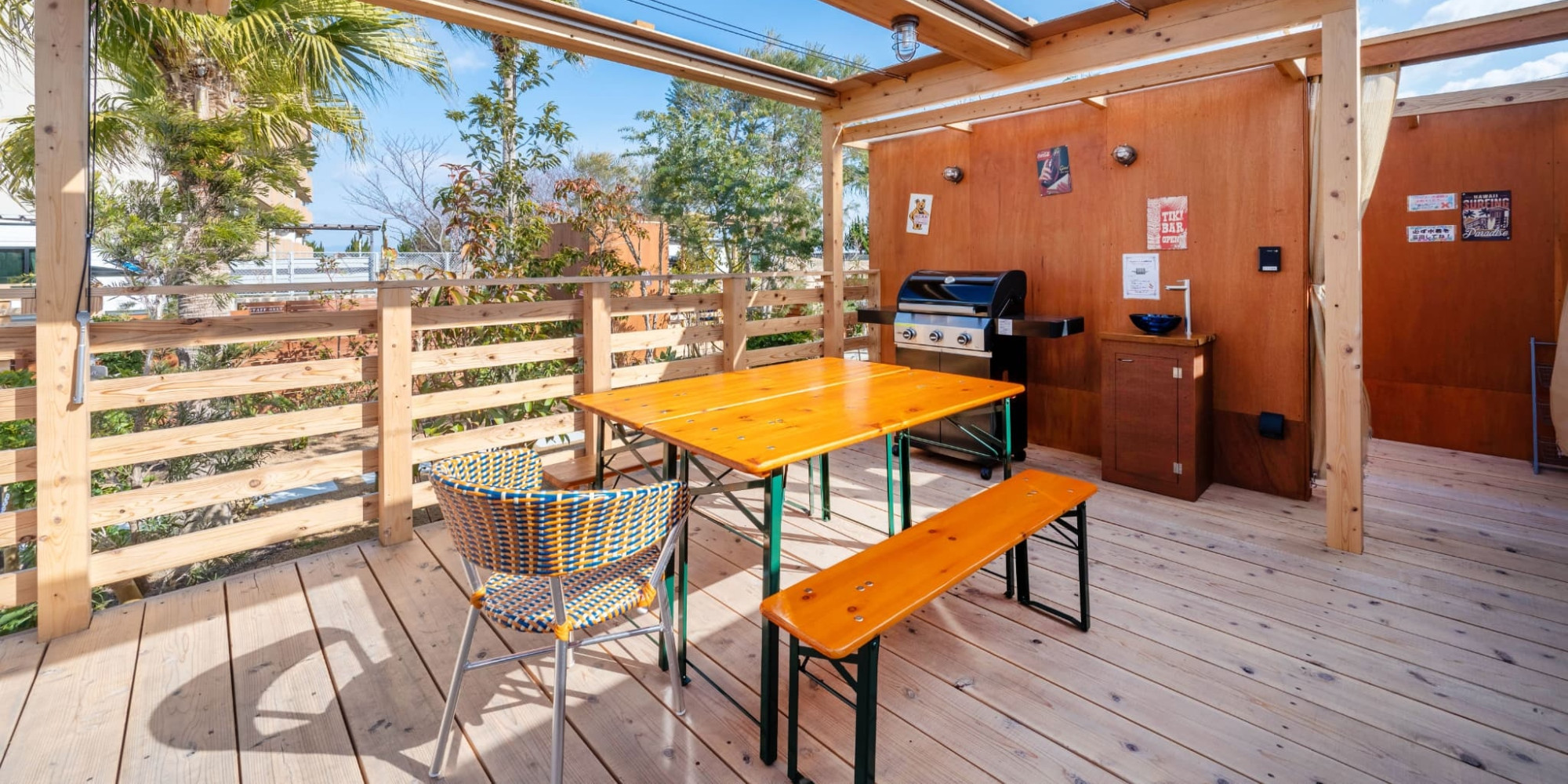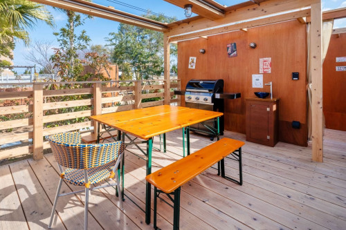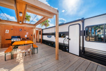 トレーラーハウス前のウッドデッキには屋根付きBBQテラスとジェットバスがあり、手ぶらでお越しいただいても快適にお過ごしいただけます。