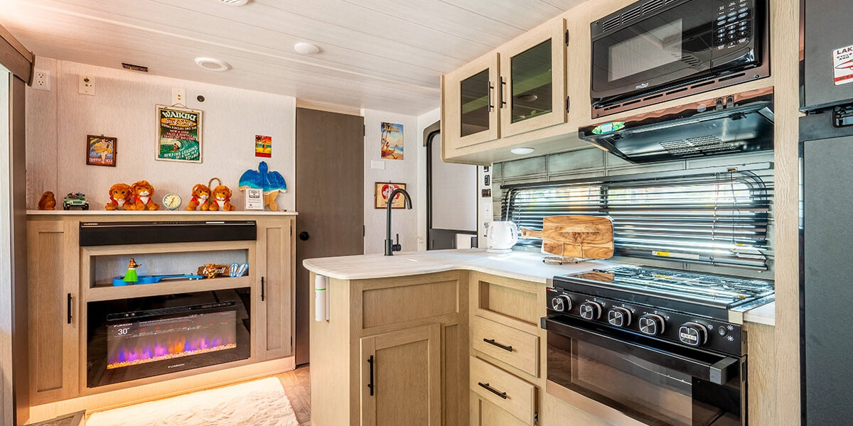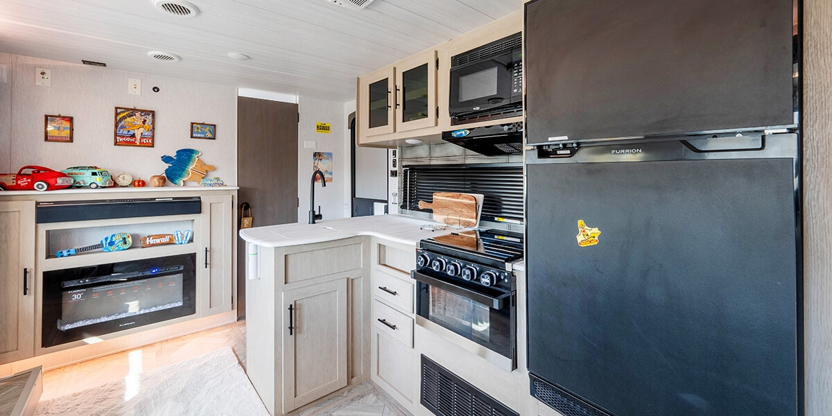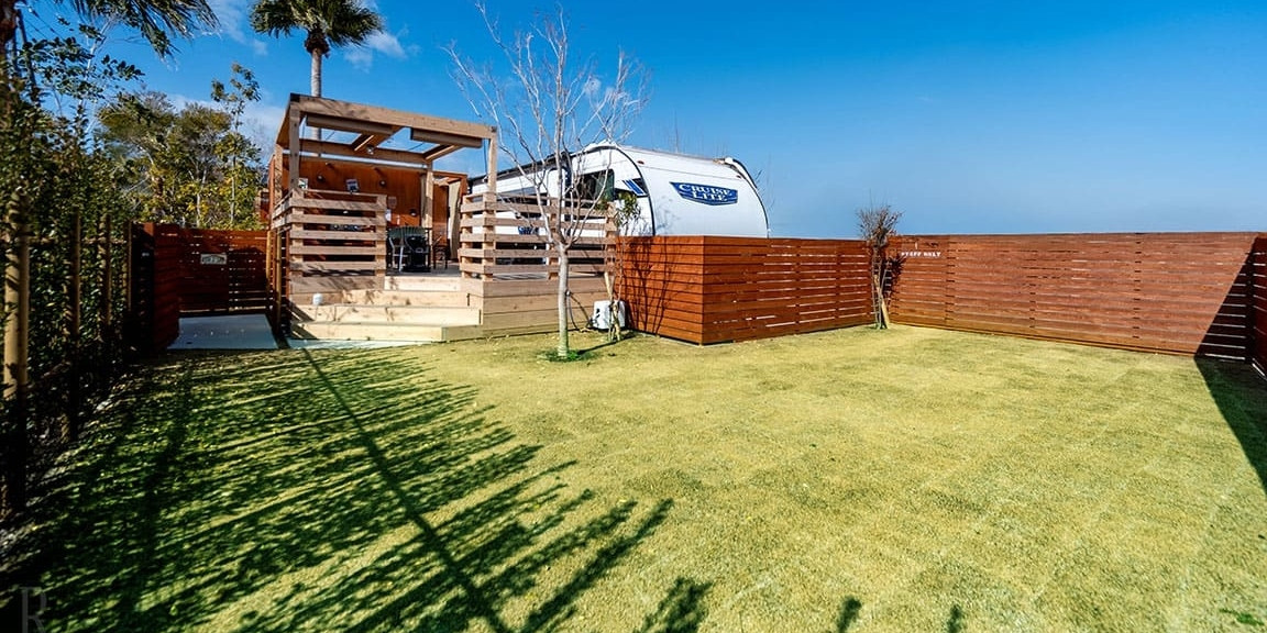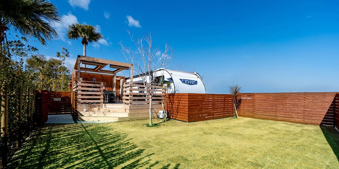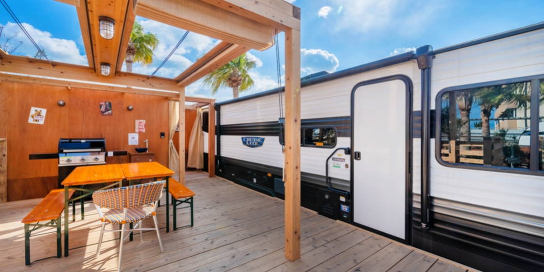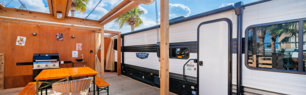 バーベキューテラスなどの設備充実のハワイアンリゾートが満喫できるトレーラーハウスで快適で思い出に残るグランピングを体感してください。