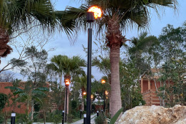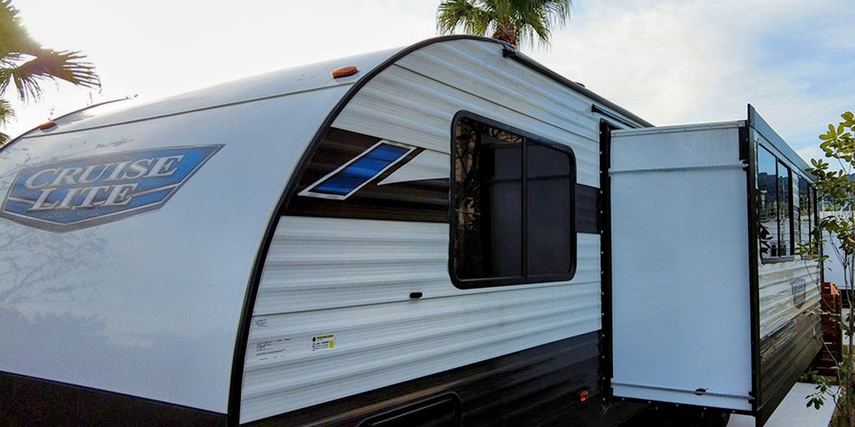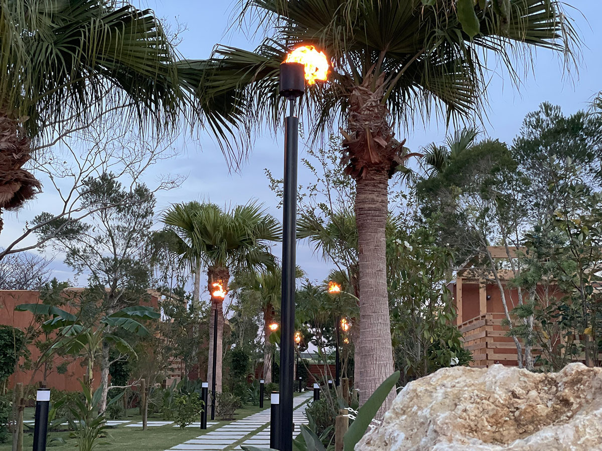 ヤシの木に囲まれ、夜にはガス灯が灯るリゾート感あふれる快適なトレーラーハウスと