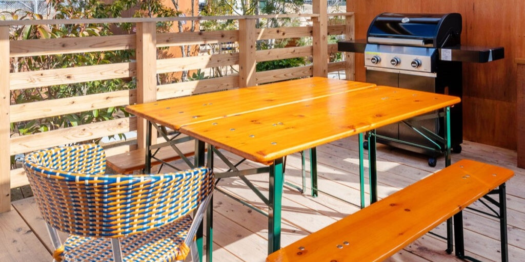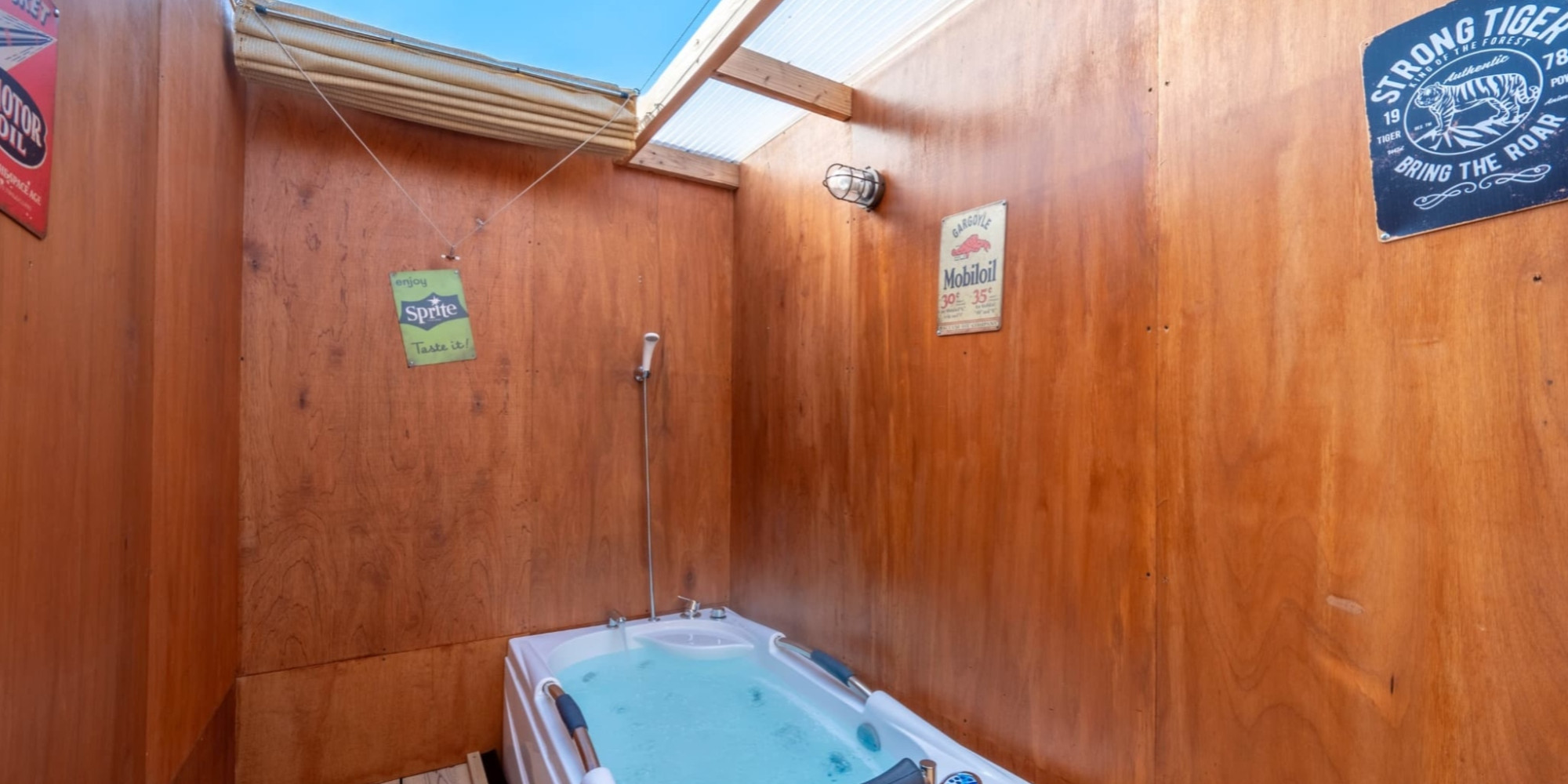 トレーラーハウス前のウッドデッキには屋根付きBBQテラスとジェとバスがあり、手ぶらでお越しいただいても快適にお過ごしいただけます。
