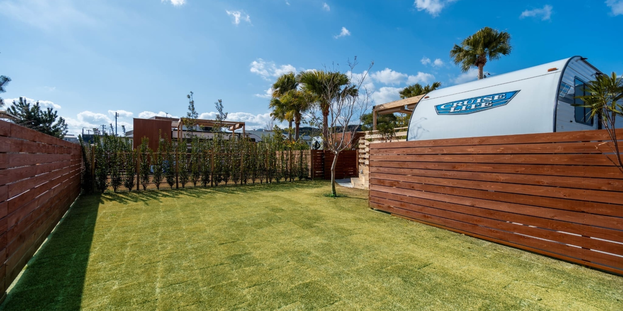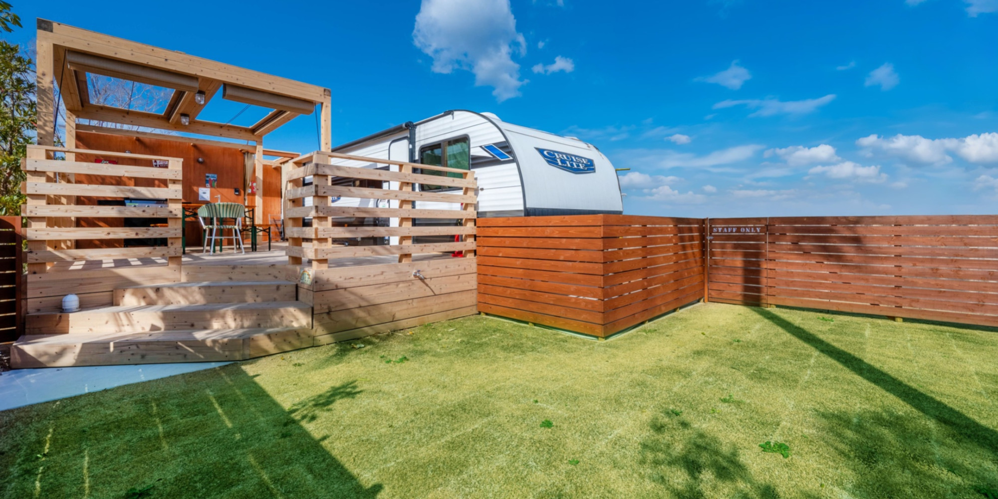 トレーラーハウスには専用のドッグランスペースが併設されており、ワンちゃんは自由に走り回ることができます。