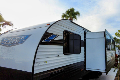 ヤシの木々に囲まれた、アメリカンスタイルのトレーラーハウスです。