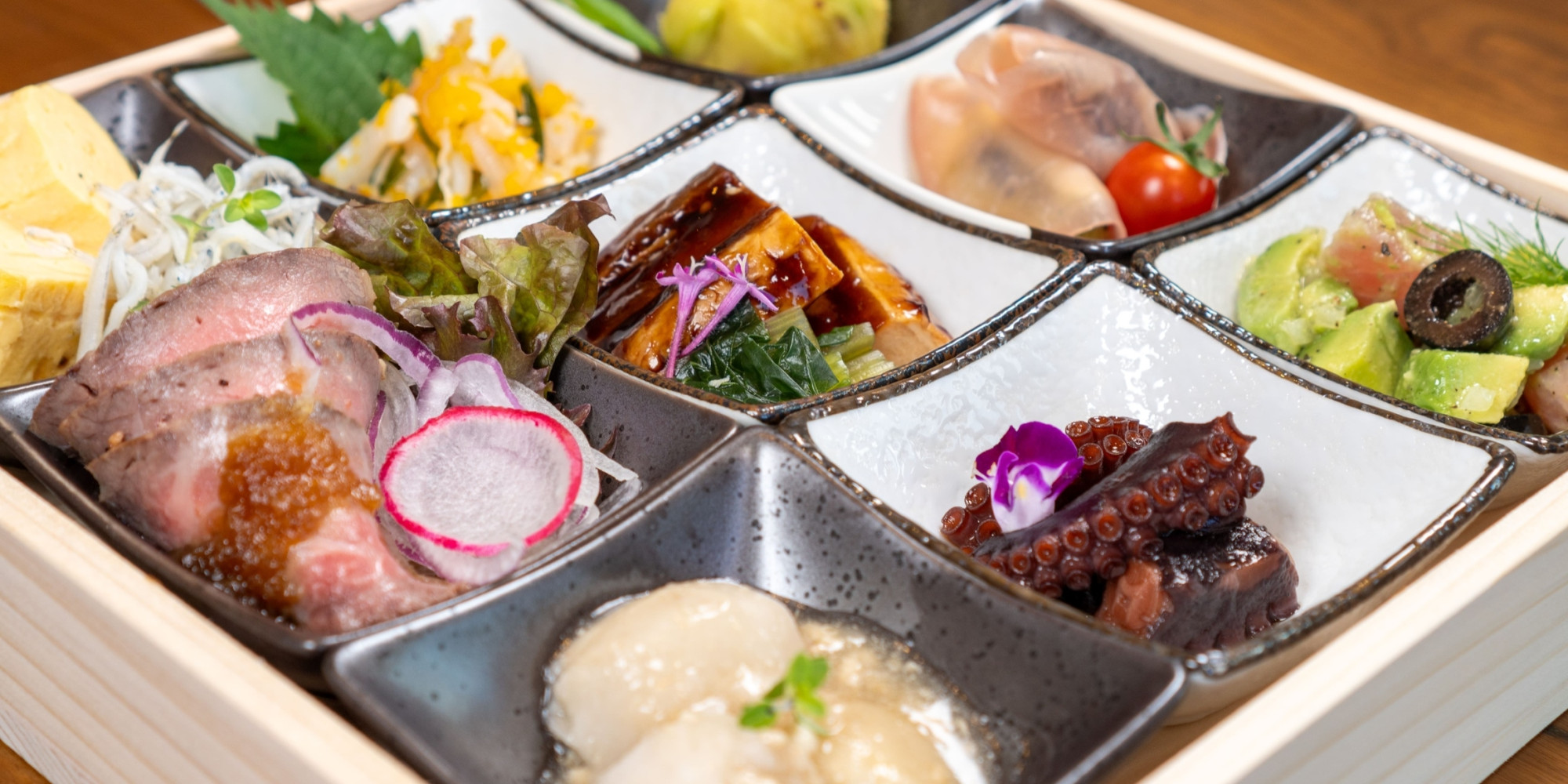 淡路島の食材を中心に、さまざまな料理で少しずつ楽しめる和食御膳。
