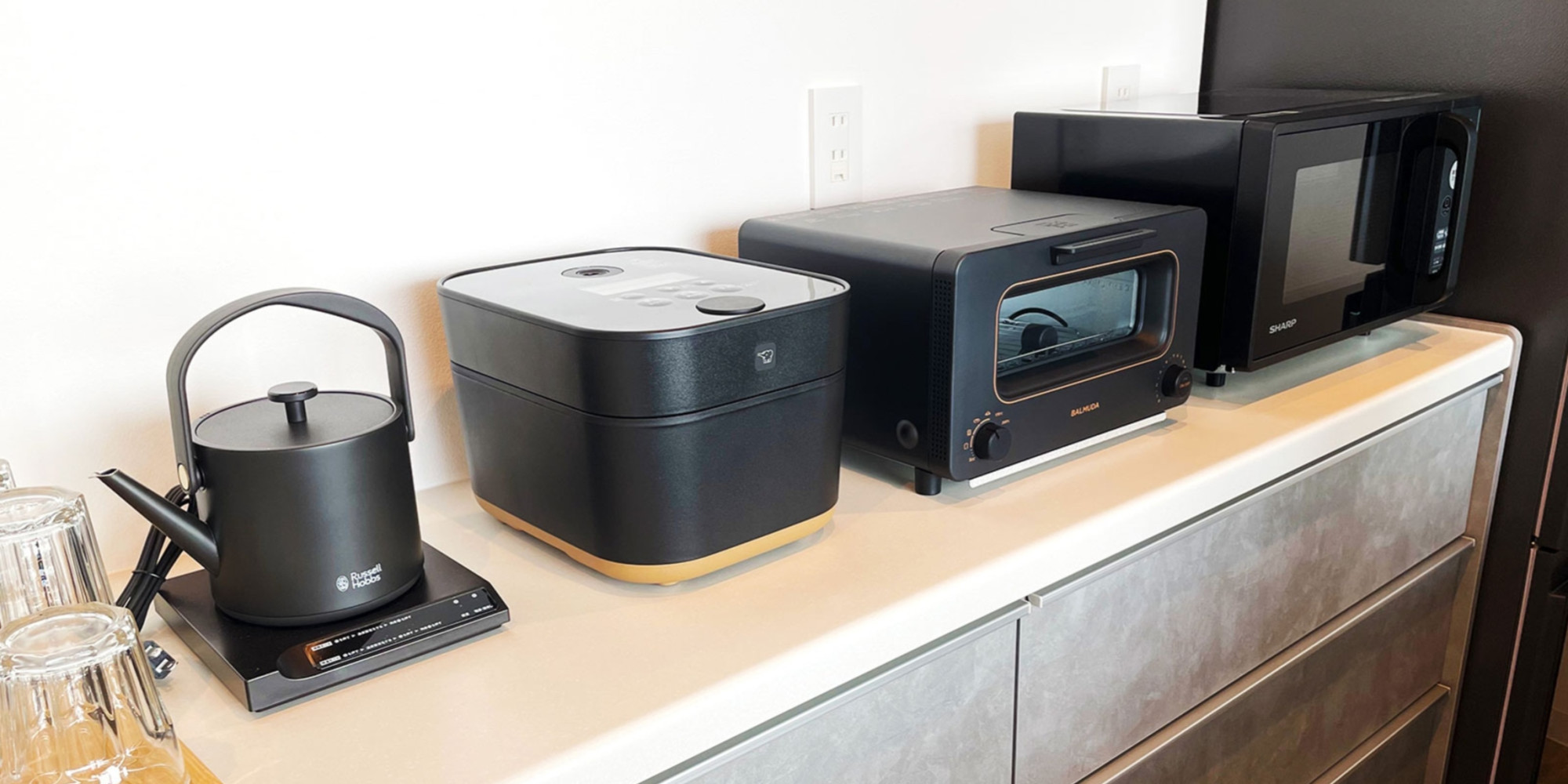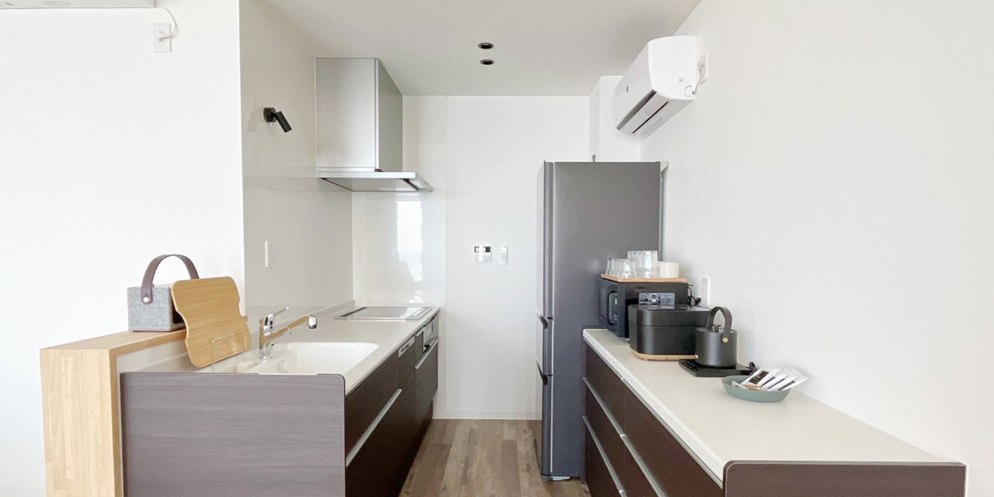 アメニティグッズ、キッチン備え付けの食器や調理器具、調味料については、下記ページでご案内しています。