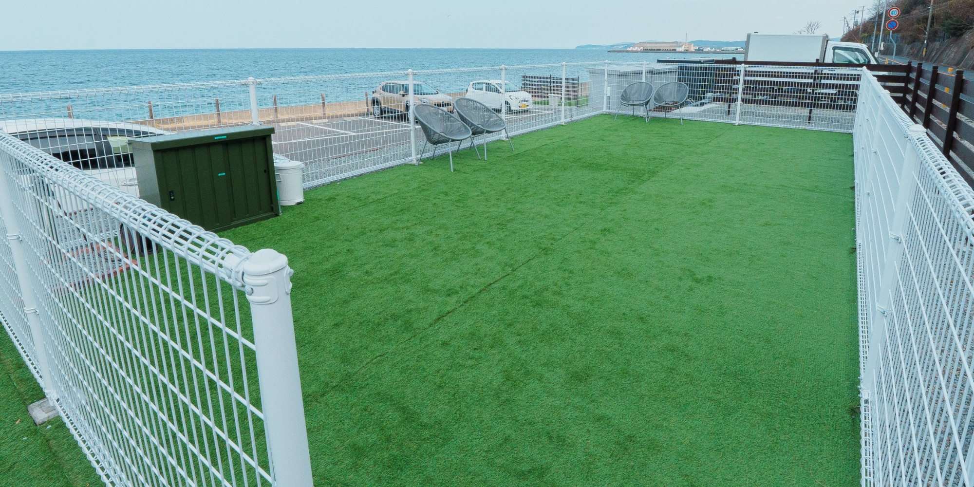 海風が感じられる気持ちのいいドッグランで、飼い主様もワンちゃんも、のびのびとお過ごしいただけます。