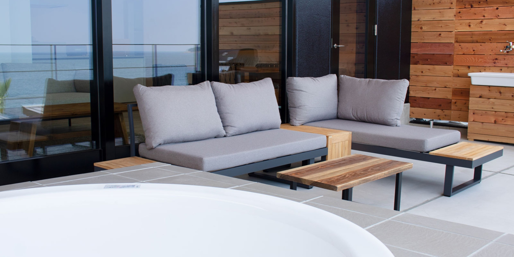 テーブルとソファのセットを備え、外の空気をゆったりと堪能していただけます。