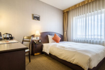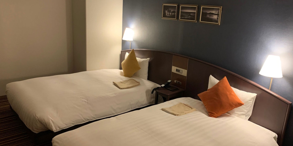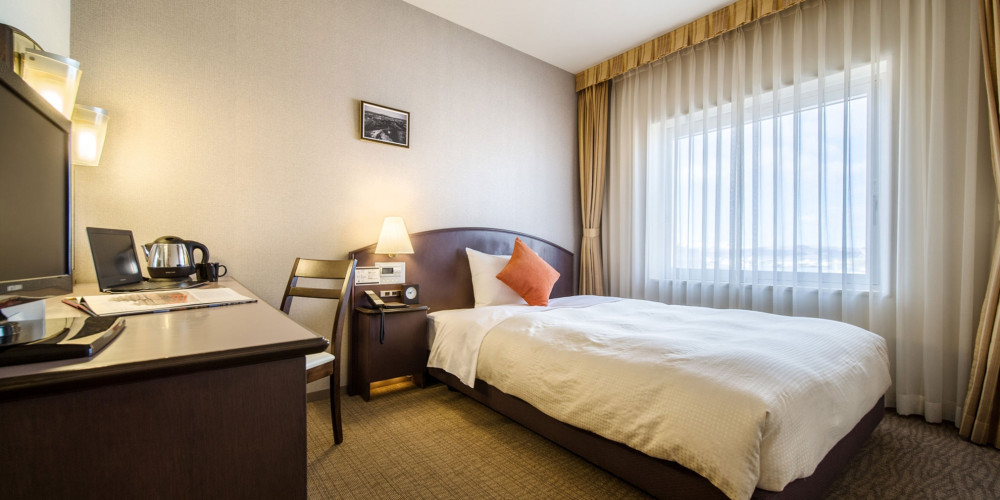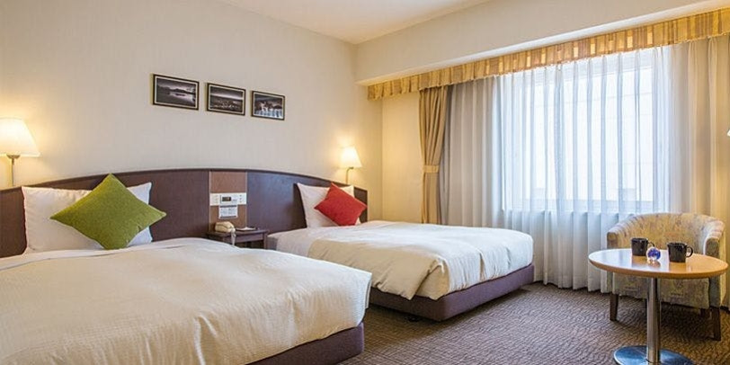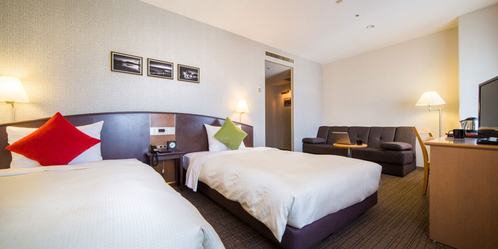 広々としたベッドのあるモダレットダブルルームからは、函館湾を一望できます。