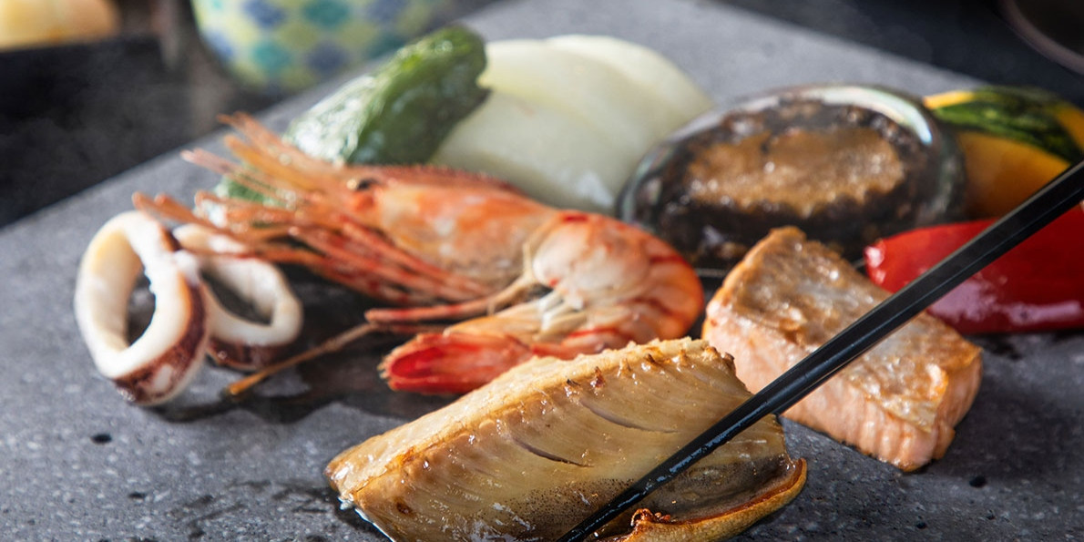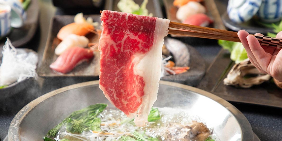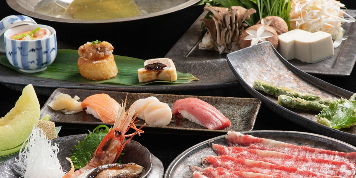 北海道交雑牛のしゃぶしゃぶ、旬の天麩羅、寿司の計7品をご用意いたします。函館の夜景を眺めながら夕食をお楽しみください。