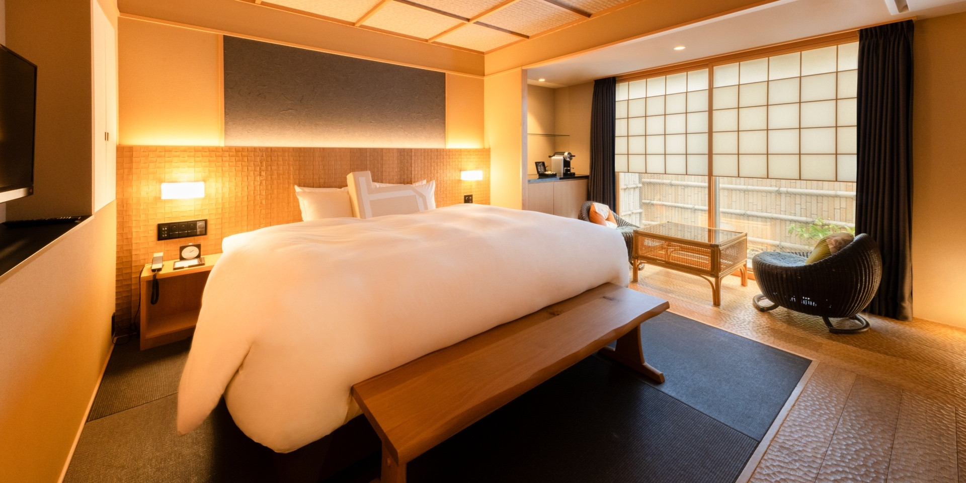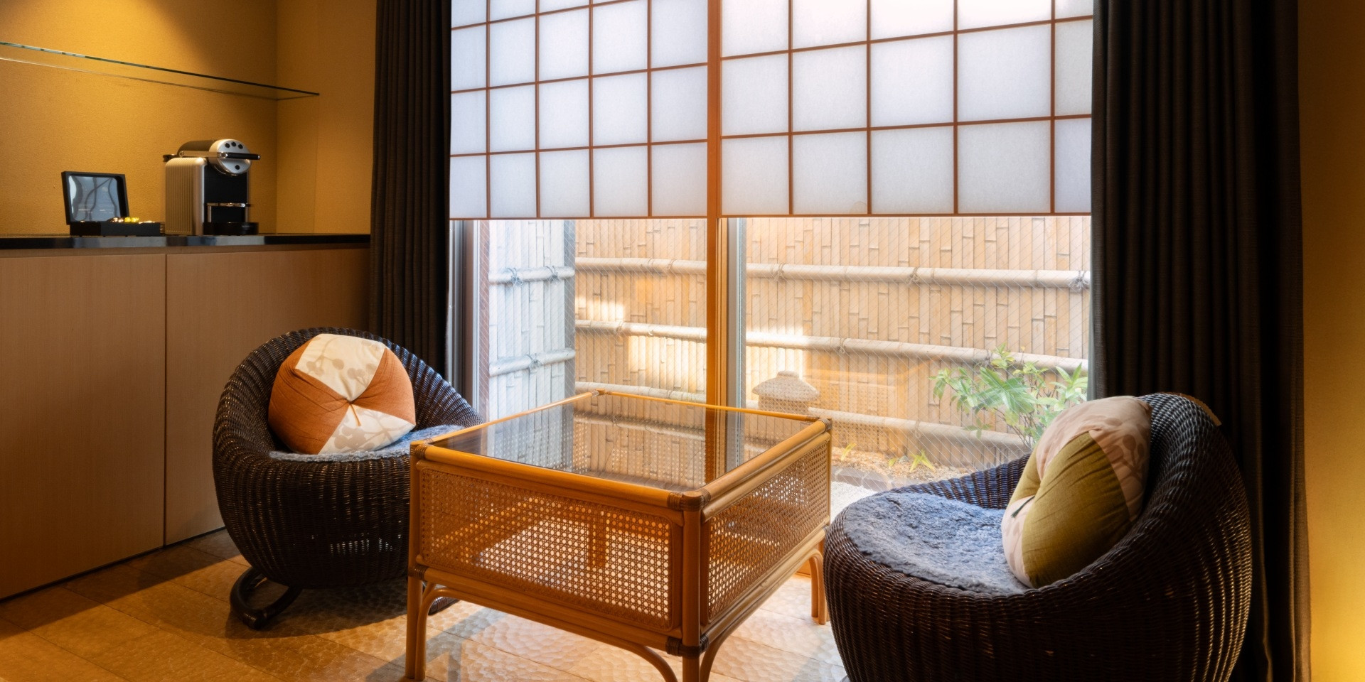 客室はわずか9室で、主要観光スポットの喧騒から離れ、静かな居住空間とプライベートな隠れ家を提供いたします。同時に、ホテルはJR嵯峨嵐山駅のすぐそばにあり、新進気鋭のカジュアルダイニング、地元の方に愛されるレストラン、バー、地元の特産品店などが豊富なエリアに位置しています。竹林や嵐山のメインストリートへも徒歩10分圏内のところにあり、愛宕神社やあだし野念仏寺などニッチな観光スポットへもアクセス可能なりケーションで、いつもとは一味違った嵐山旅をお楽しみください。