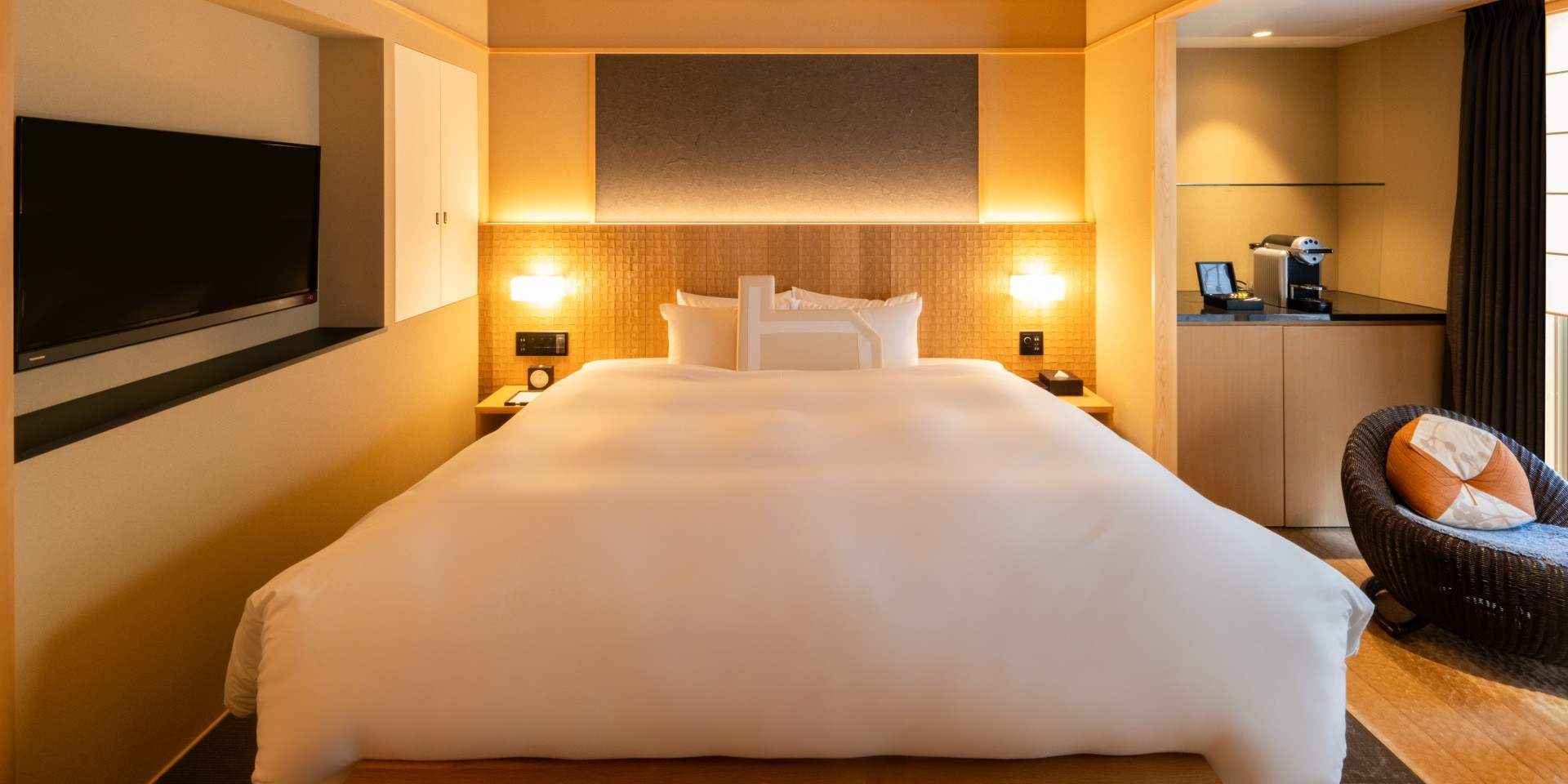 シモンズ製のキングサイズベッドとくつろぎのソファを備え、心安らぐひとときをお過ごしいただけます。
