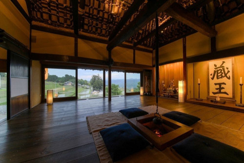 圧巻は何と言っても、窓間口を2間×2とし、通常は8枚割りのガラス戸を4枚割りにした大型ガラス戸で、囲炉裏から眼前に広がるパノラミックな絶景の棚田と、