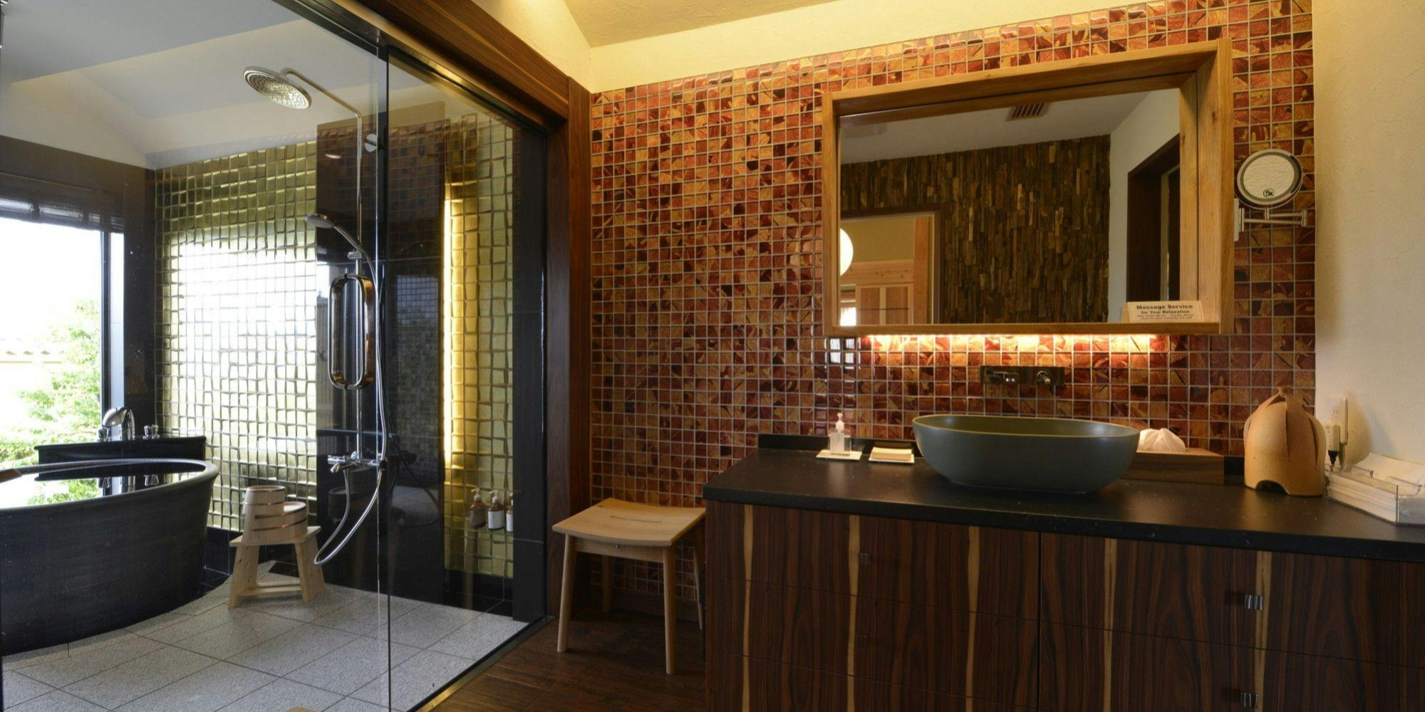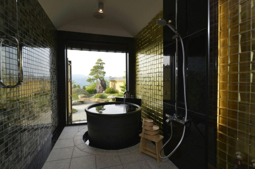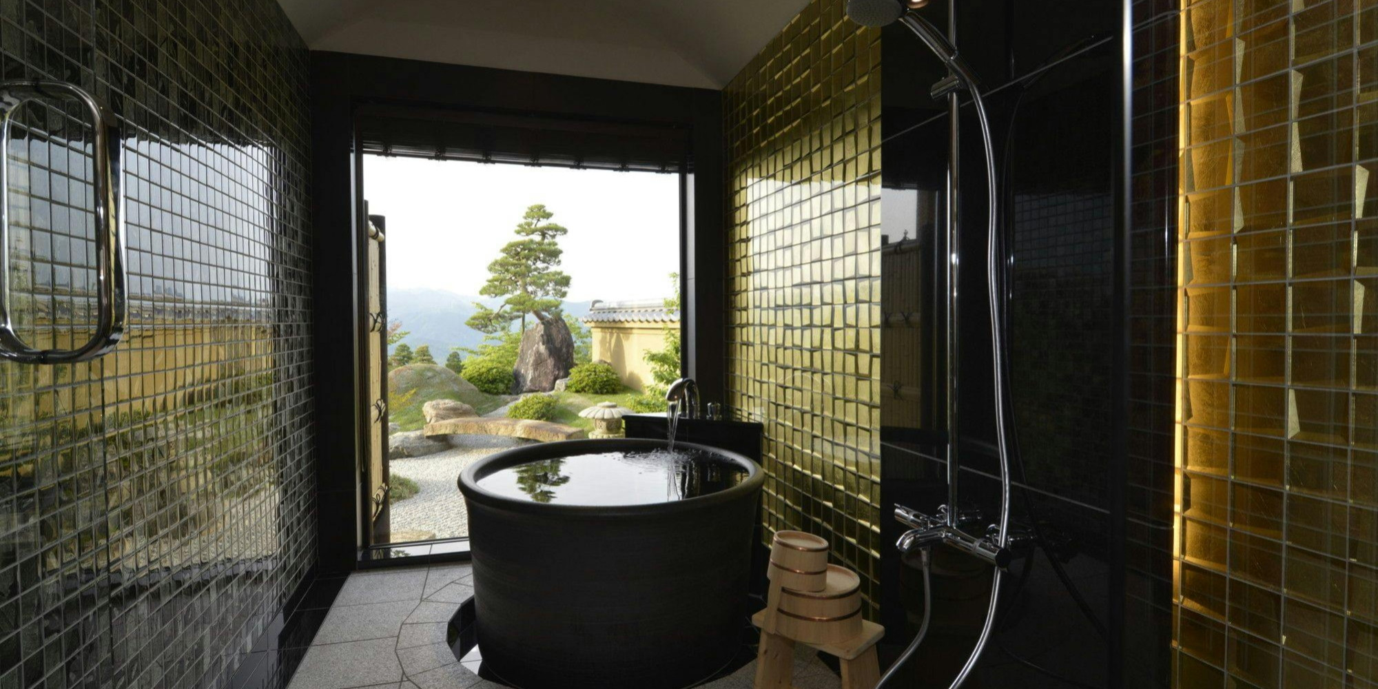 金色のタイルの高級感あふれる浴室、目の前には日本庭園広がる非日常感。