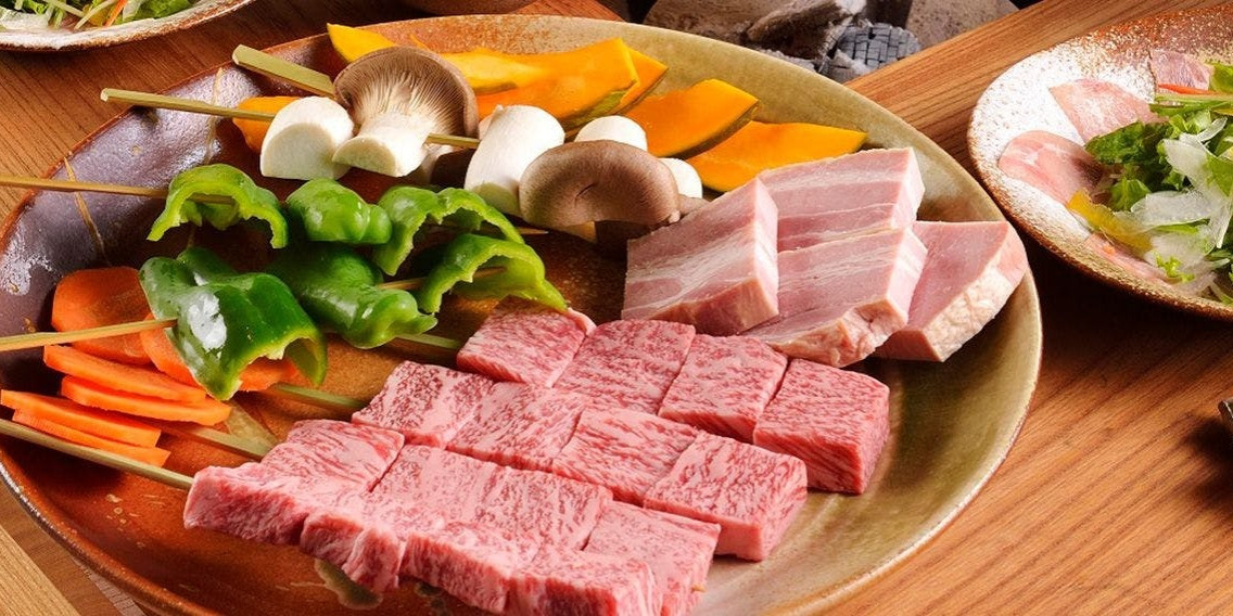 三重県伊賀地方の名張市内で育てられているブランド黒毛和牛肉「伊賀牛」を使用したお料理、実際に囲炉裏で作るお料理などをご用意しております。