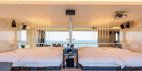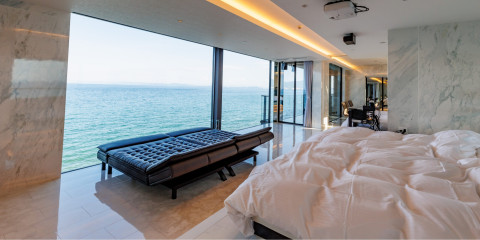 ひとたび客室に入れば、真っ白な空間と目の前に広がる青い海。