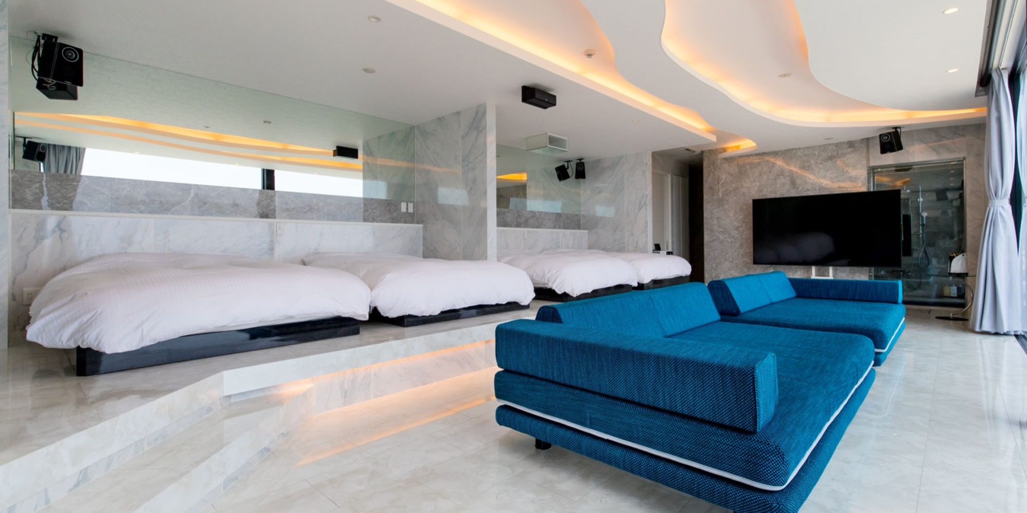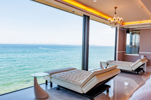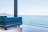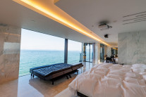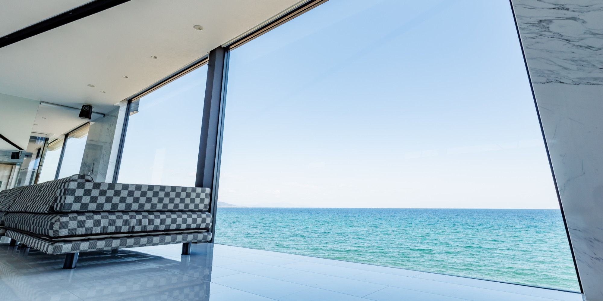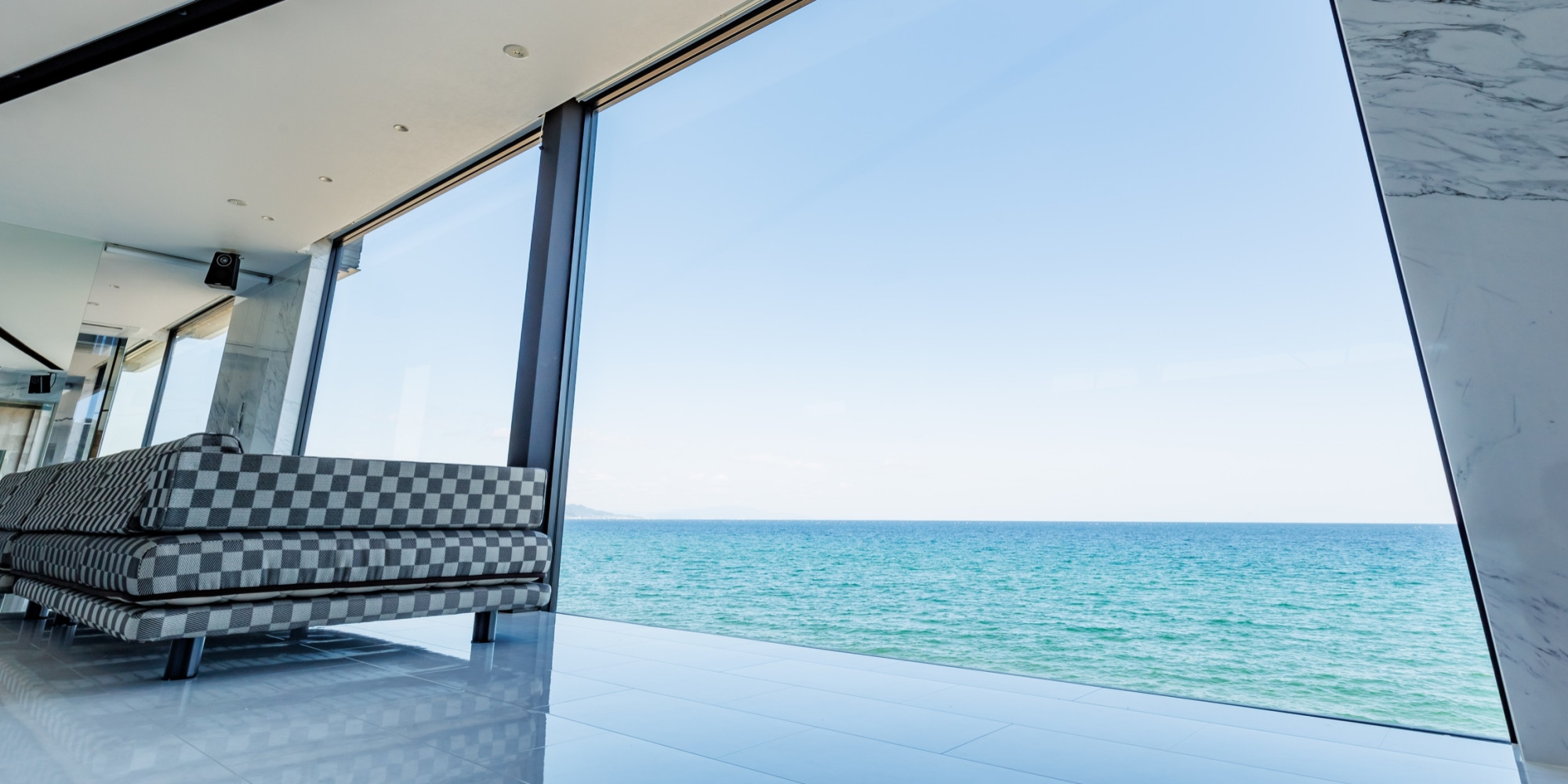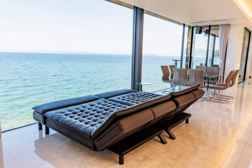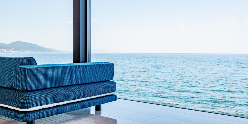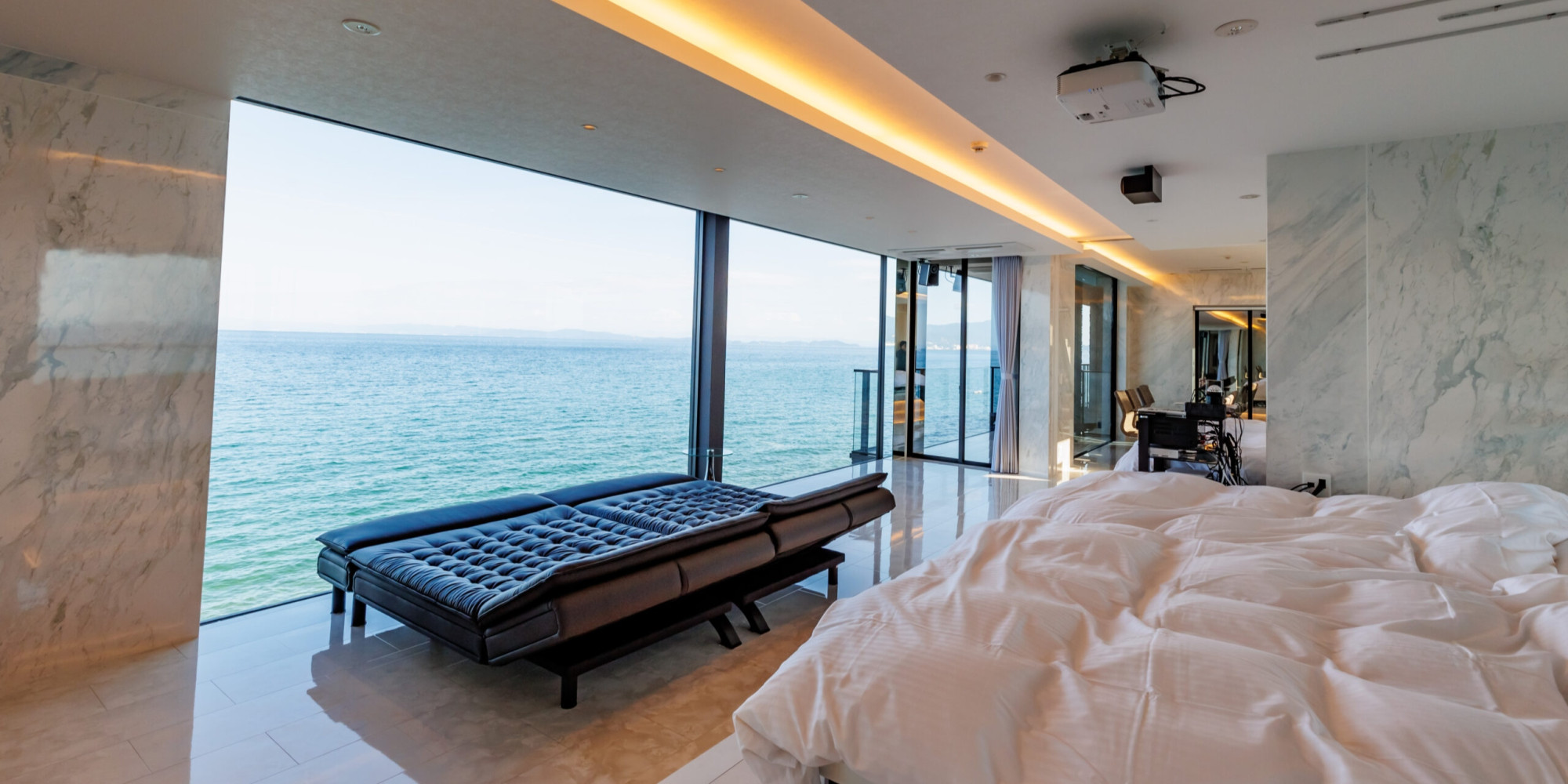 ひとたび客室に入れば、真っ白な空間と目の前に広がる青い海。
