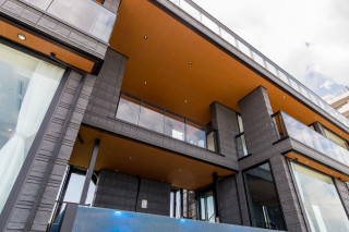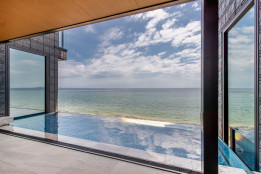 空・海・プールのブルーを活かす、白と黒を基調とした内装