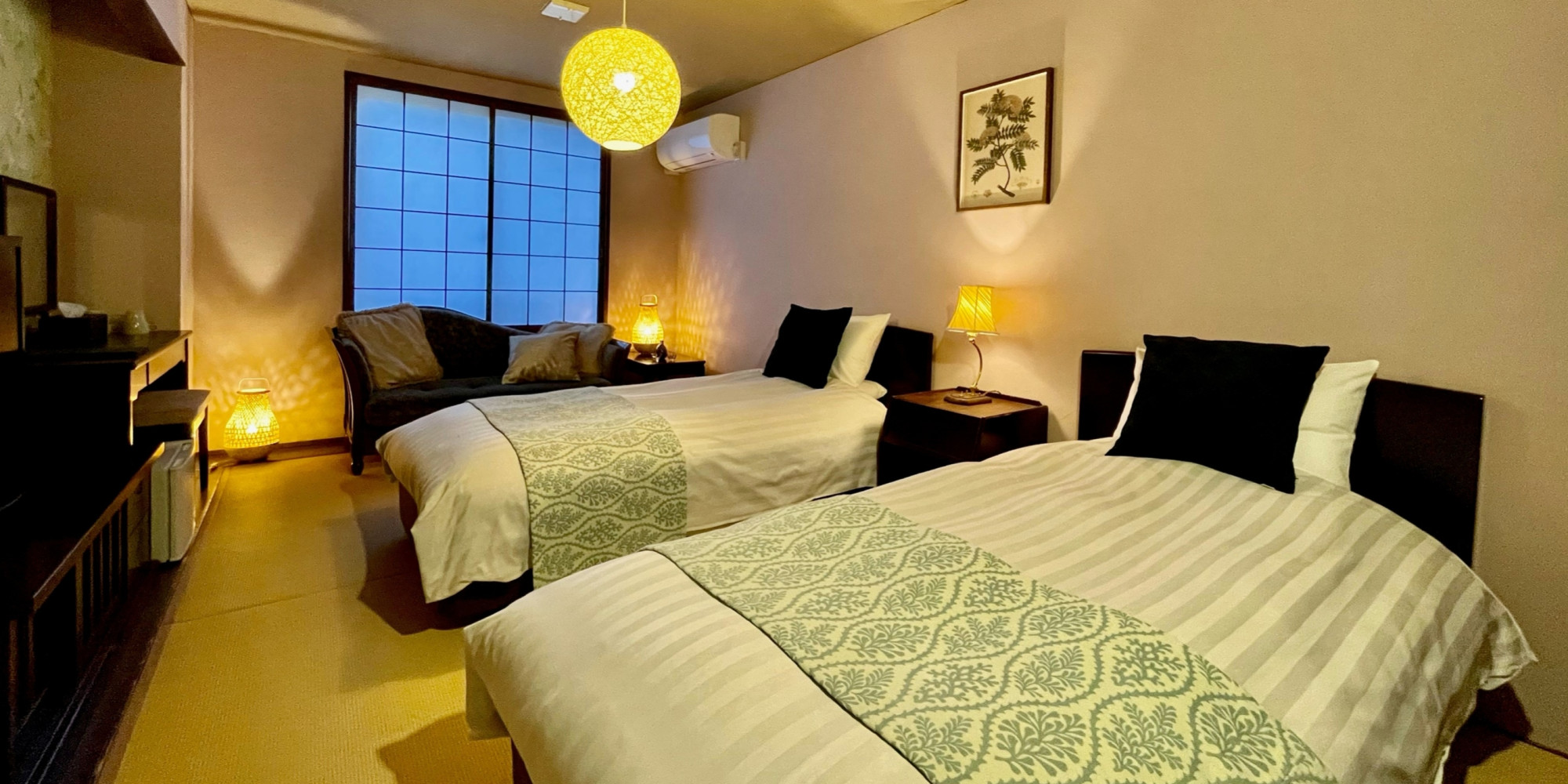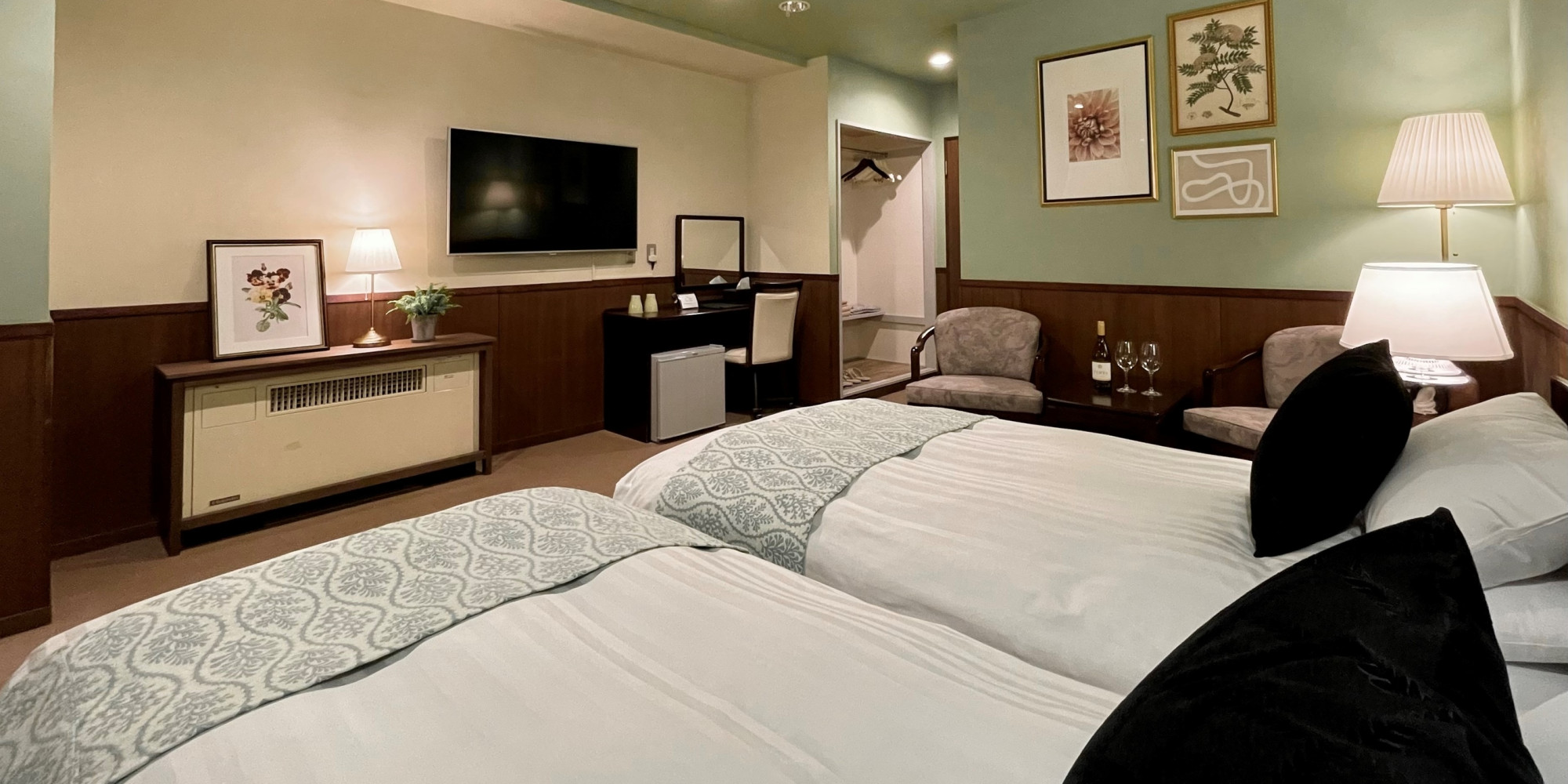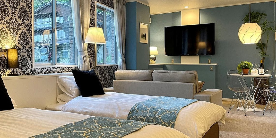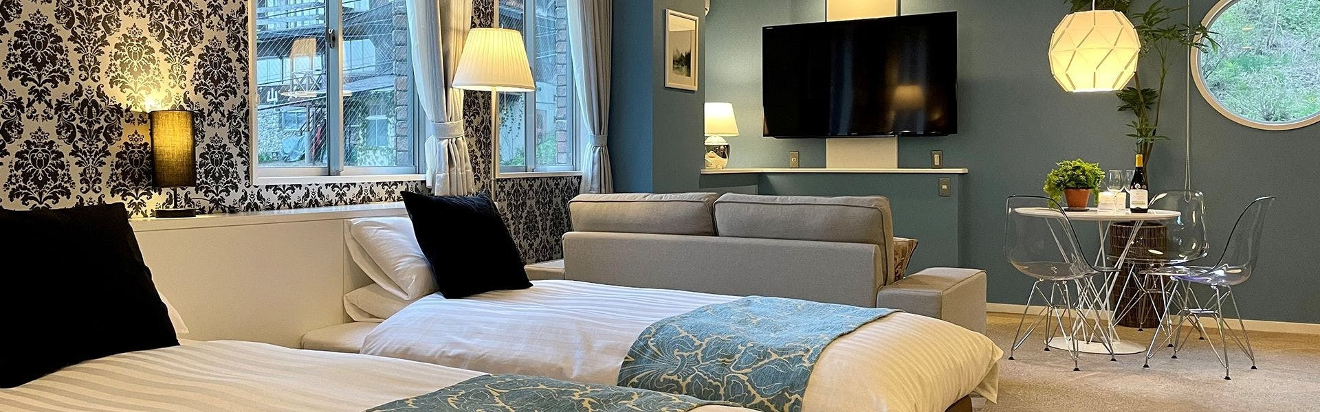 ゲストルームは部屋ごとに異なるインテリアコーディネイト。フリードリンクをいつでも楽しめるフリースペースもグリーンで癒されます。
