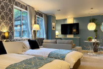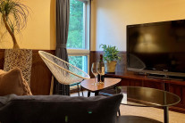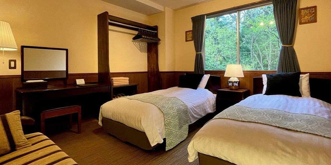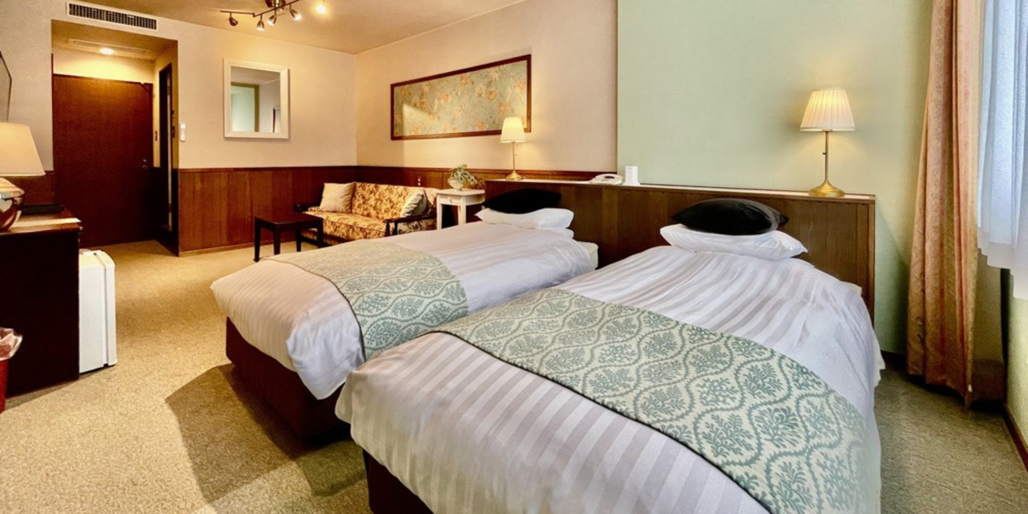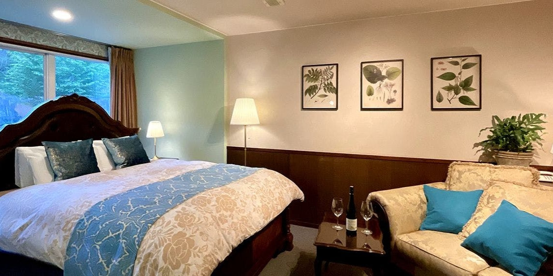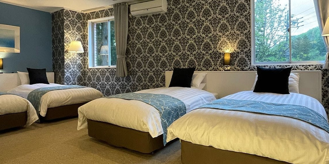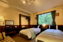 ゲストルームは部屋ごとに異なるインテリアコーディネイト。フリードリンクをいつでも楽しめるフリースペースもグリーンで癒されます。