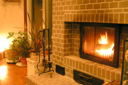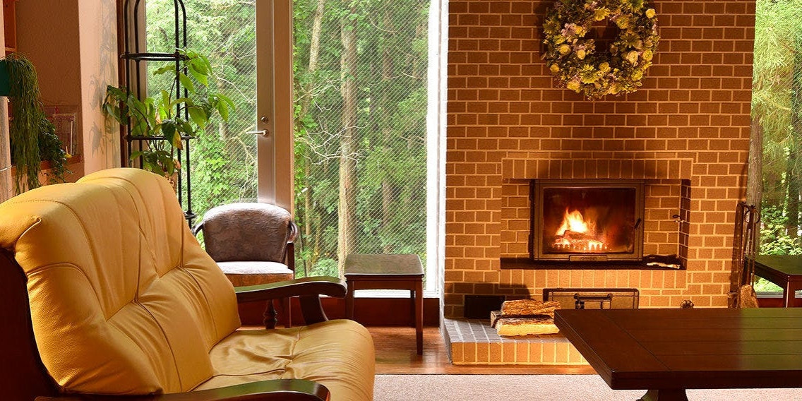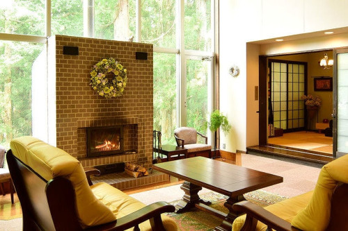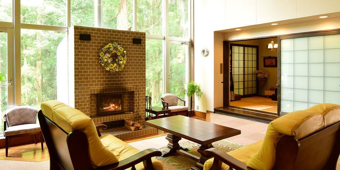 高さ7Mの大開口からのぞむ白馬の森とさわやかな風。木々の枝に積もる雪と赤々と燃える暖炉の炎。