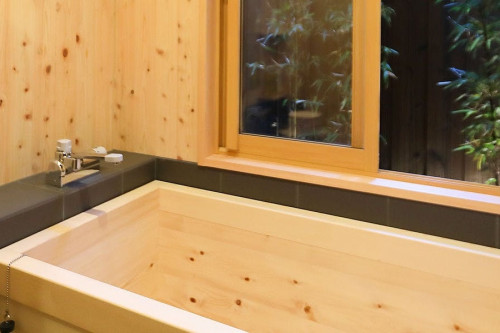 ひのきのお風呂、坪庭を望みながらお楽しみ頂けます。