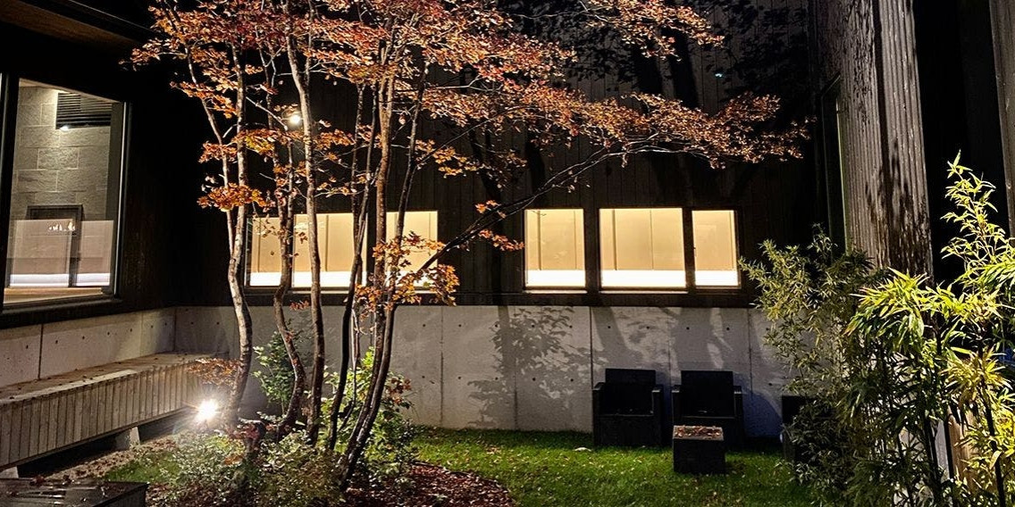 外のお庭も綿密にデザインされており、手入れの行き届いた植栽や灯篭から燿るライトが夜も美しく演出します。