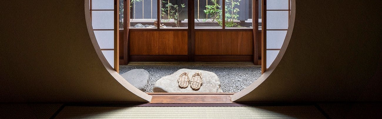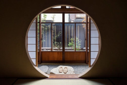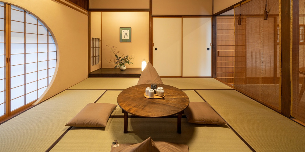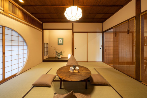 1階和室、美しい丸形の障子戸の向こう側には町家らしい坪庭があり、