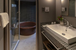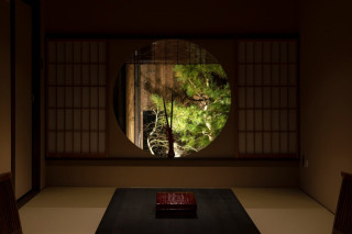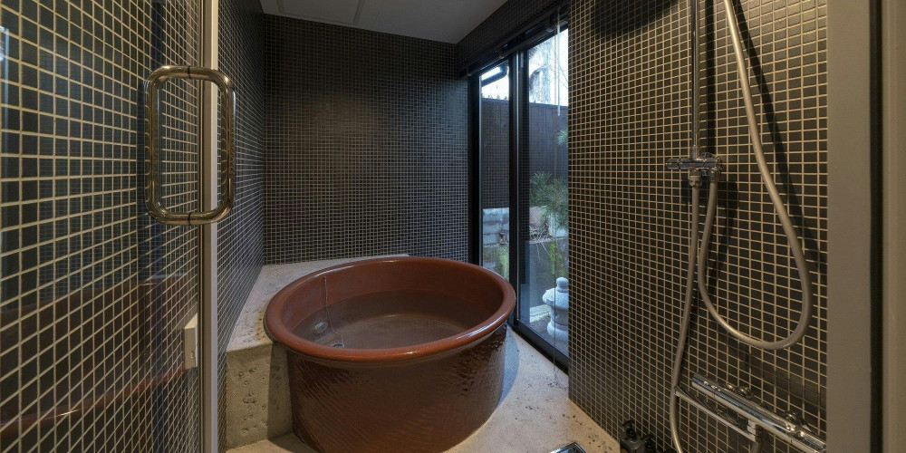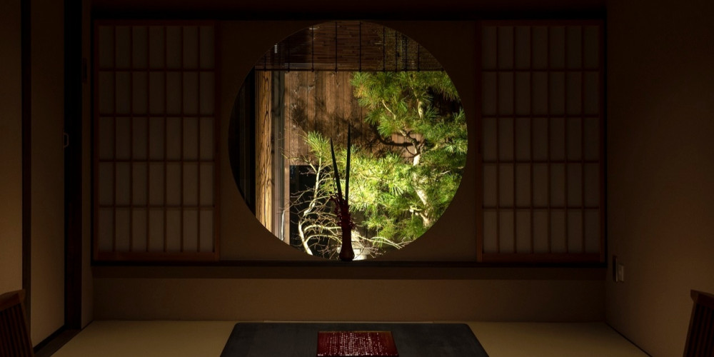 丸い形をモチーフにした室内には、情緒ある庭が一望できる丸窓、五右衛門風呂を思わせる丸い浴槽、