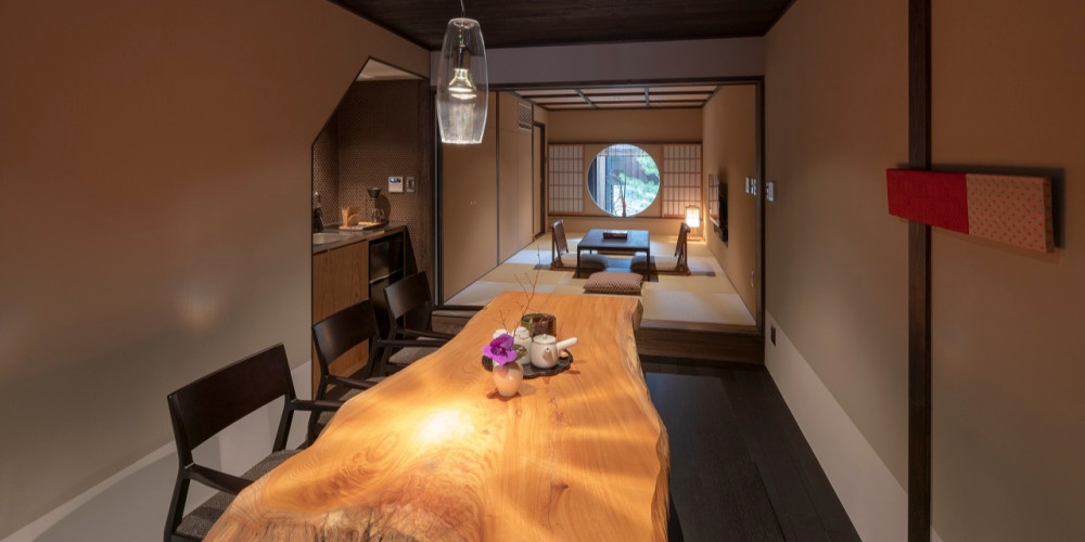 一枚板のテーブルを囲んで団欒したり、琉球畳の上で足を伸ばしてお寛ぎいただけます。