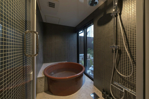 モダンな五右衛門風呂を思わせる浴室。大きな窓からは庭の景色や小川が望めます。