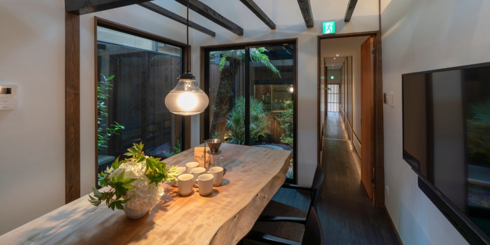 無垢の一枚板のテーブルが置かれ、窓からの金沢の町家らしい中庭の景色と吹き抜けの木組みがまるで自然の中にいるような空間。