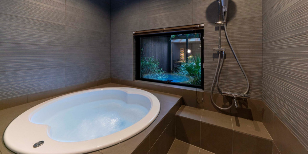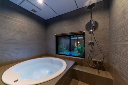 清々しい町家の中庭の景色が望める浴室の大きな円形浴槽は「照明付きジャグジー」。