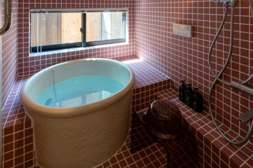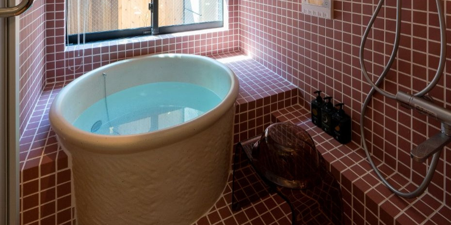 坪庭の眺めを楽しめる浴室を備えたプライベートな一棟貸し。