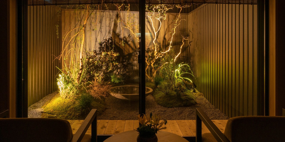 窓からは坪庭が眺められ、夜はライトアップされた景色を楽しめます。