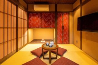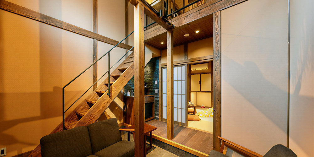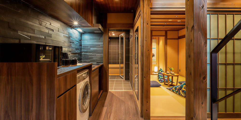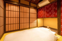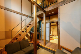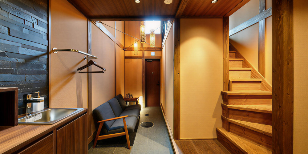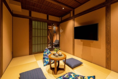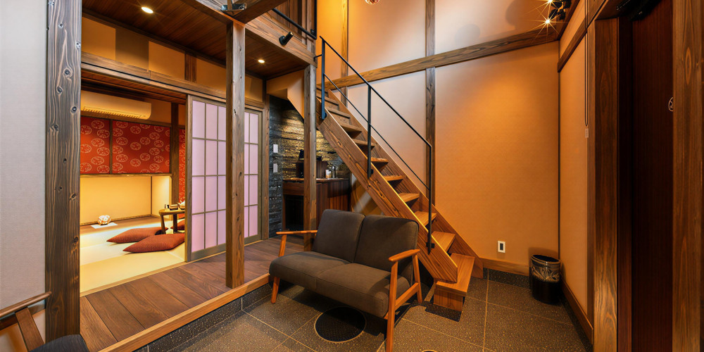 「加賀友禅」をテーマとした町家。大胆な柄の友禅を施した吊りアートや藍色を散りばめた空間です。