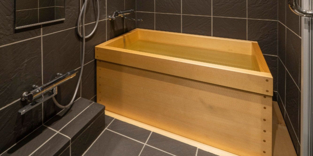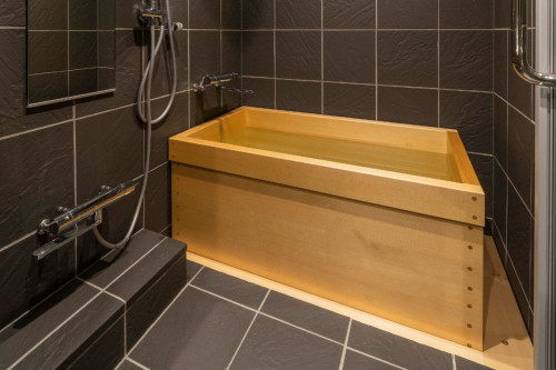 ヒノキの浴槽に、濃いグレーの壁がスタイリッシュな浴室。