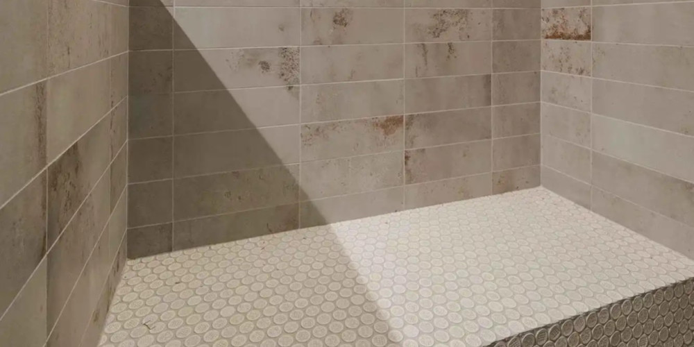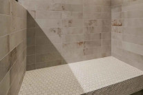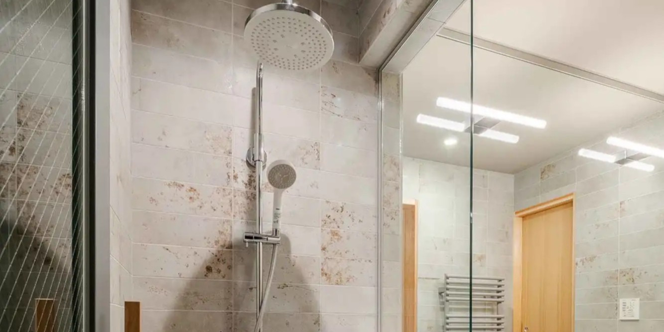 オーバーヘッドシャワー付きのシャワーブースは室内に。