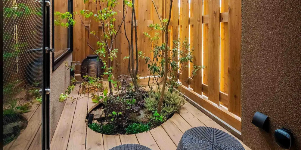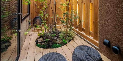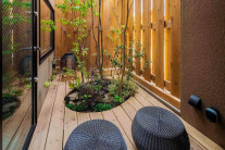 四季の移り変わりや心地よい風を感じられるウッドデッキ調の坪庭。