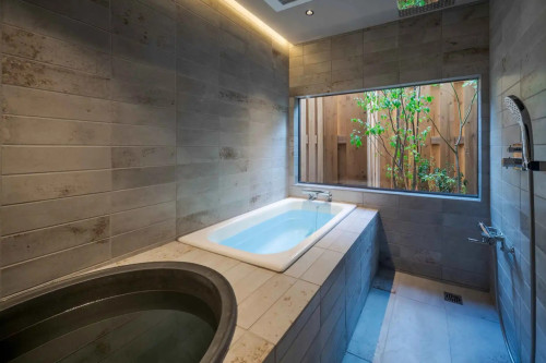 大きな窓から瑞々しい坪庭を眺めながらリフレッシュできる浴室。