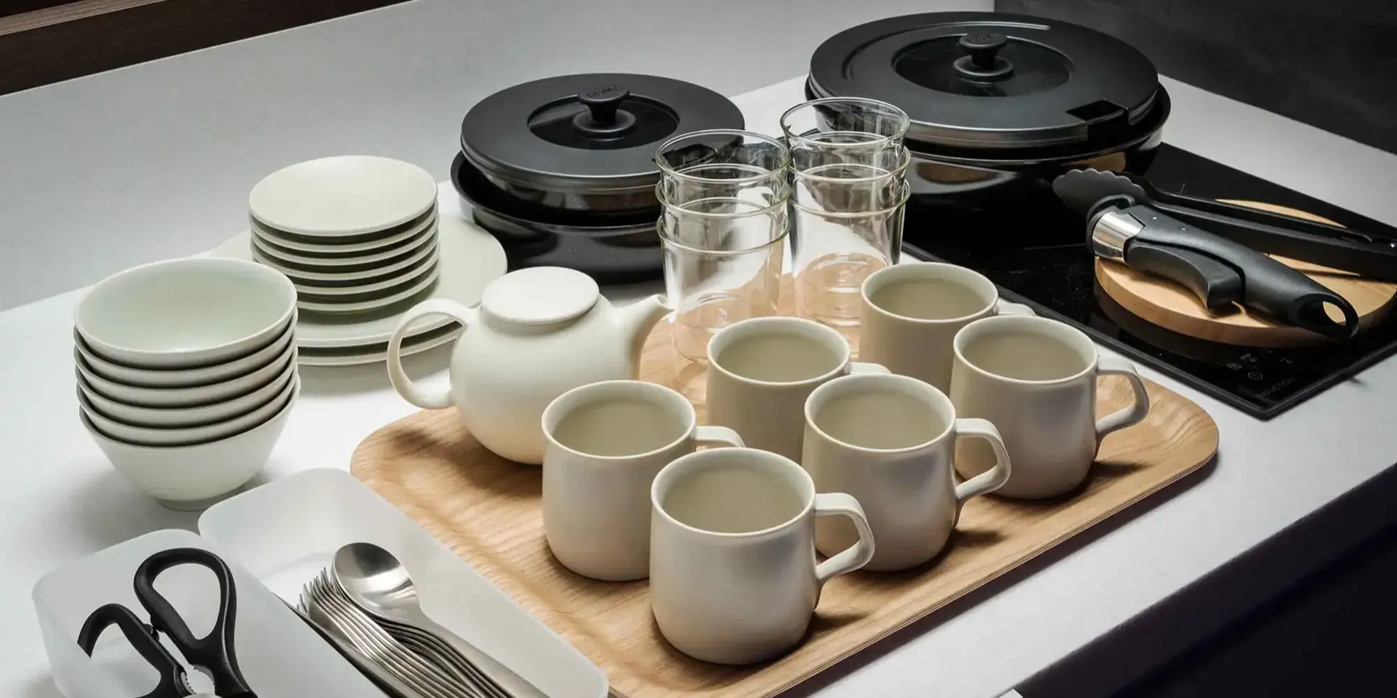 食器類・調理器具に、IHコンロ・電子レンジ・炊飯器なども備えたキッチン。