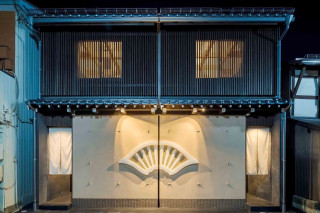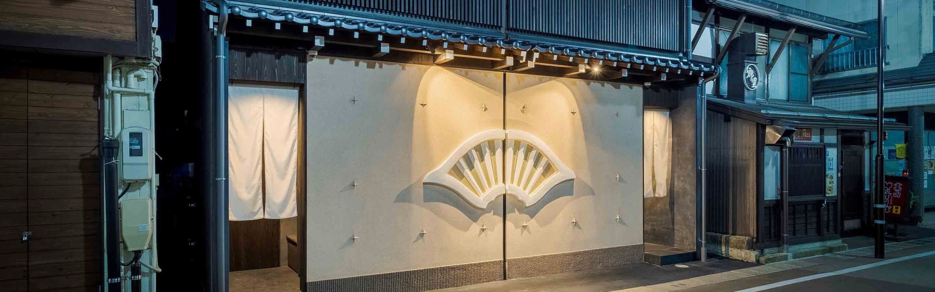 町家内の光庭の壁面には、高山祭の山車を装飾する見送り幕をモチーフとした高さ9mの大作が掲げられ、左官コテで気迫が込めて描かれた筋が見る者を圧倒します。
